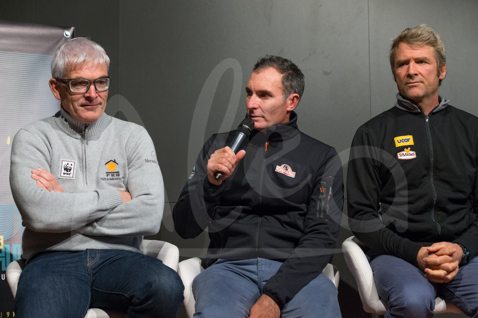 Description | skippers Vincent Riou (PRB), Jeremie Beyou (CHARAL), Yann Elies (UCAR St Michel) attending Imoca Globe series press conference during the pre-start of the Route du Rhum 2018, on October 31st, 2018 in St-Malo, north Brittany, France - Photo Jean-Marie Liot / Alea |