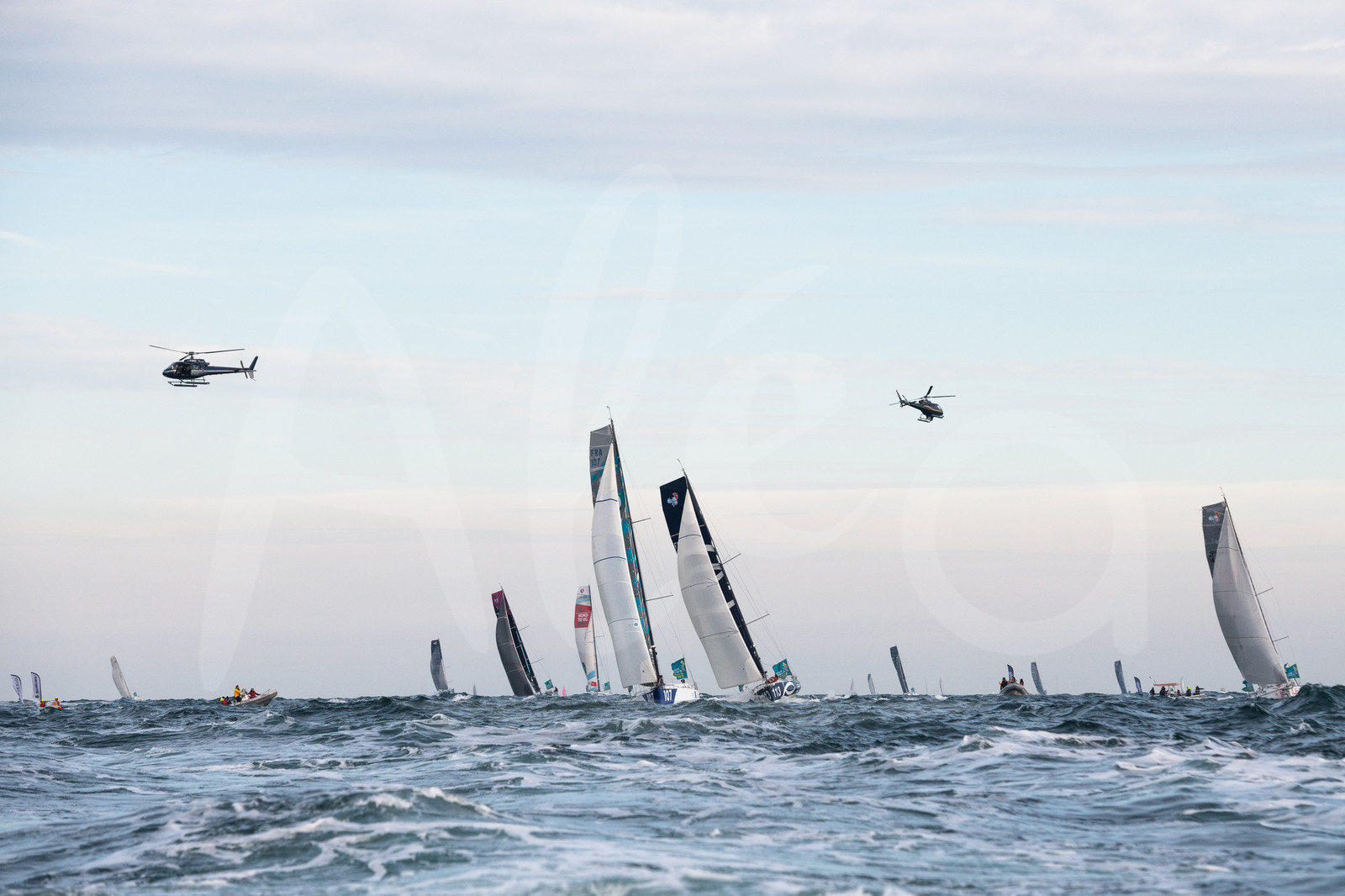 Description | General view of the fleet during the start of the Route du Rhum 2018, on November 4th, 2018 in St-Malo, north Brittany, France - Photo Jean-Louis Carli / Alea |