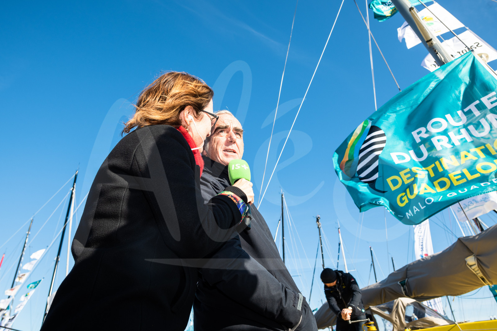 Description | Ambiance media TV for Rhum Multi Happy, skipper Loick Peyron, leaving pontoon during the pre-start of the Route du Rhum 2018, on November 3rd, 2018 in St-Malo, north Brittany, France - Photo Jean-Louis Carli / Alea |