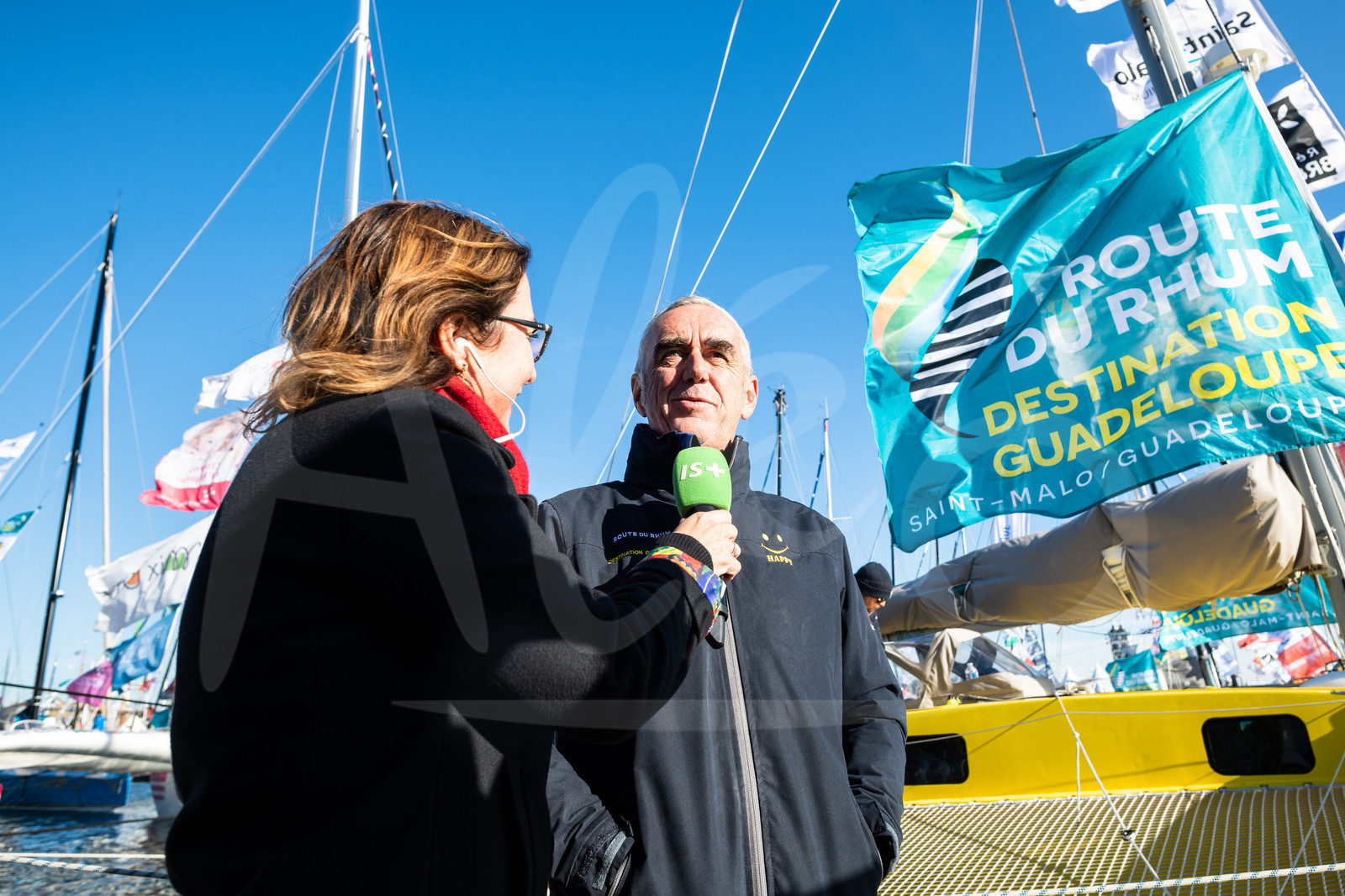 Description | Ambiance media TV for Rhum Multi Happy, skipper Loick Peyron, leaving pontoon during the pre-start of the Route du Rhum 2018, on November 3rd, 2018 in St-Malo, north Brittany, France - Photo Jean-Louis Carli / Alea |