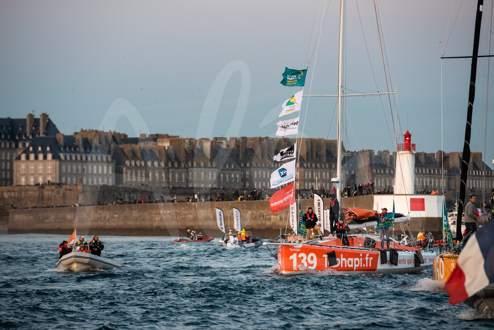 Description | General view of the public while class 40 are leaving pontoons to pass a lock towards moorings, they will spend the night before the start of the Route du Rhum 2018, on November 3rd, 2018 in St-Malo, north Brittany, France - Photo Jean-Louis Carli / Alea |