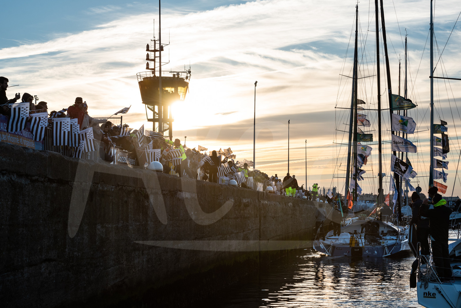 Description | General view of the class 40 leaving pontoons to pass a lock towards moorings, they will spend the night before the start of the Route du Rhum 2018, on November 3rd, 2018 in St-Malo, north Brittany, France - Photo Jean-Louis Carli / Alea |