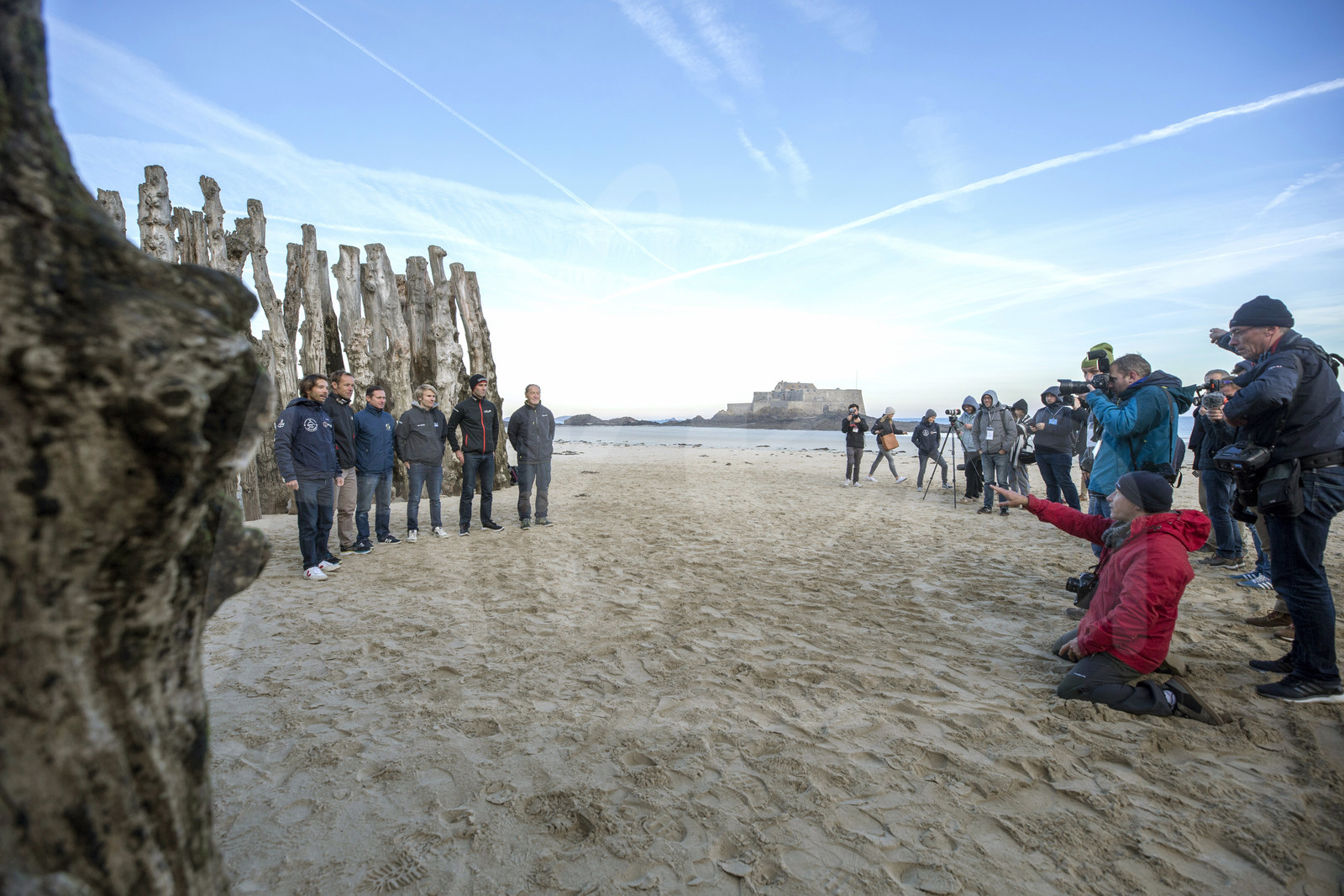 Description | Group picture of all ultime skippers, Romain Pilliard, Remade Use It Again, Thomas Coville, Sodebo Ultim', Sebastien Josse, Maxi Edmond de Rothschild, Francois Gabart, MACIF, Armel Le Cleac'h, Banque Populaire IX, Francis Joyon, IDEC Sport, on Sillon beach, during the pre-start of the Route du Rhum 2018, on November 3rd, 2018 in St-Malo, north Brittany, France - Photo Jean-Marie Liot / Alea |