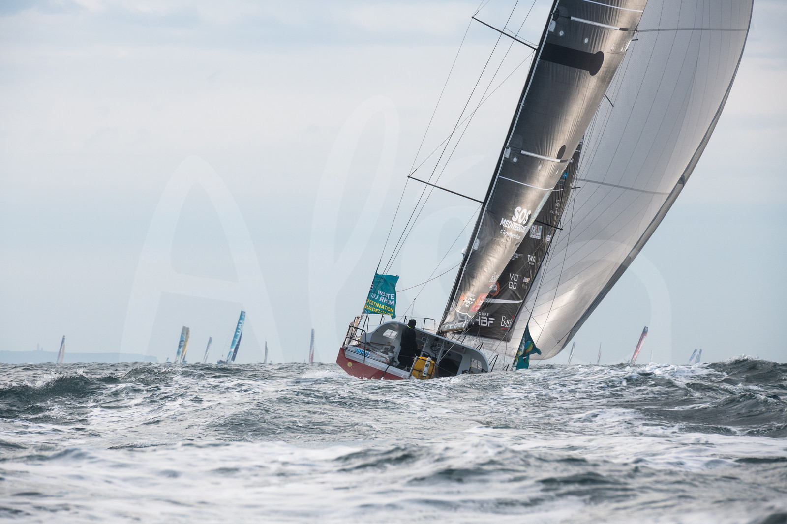 Description | class 40 Made in Midi, skipper Kito de Pavant, during the start of the Route du Rhum 2018, on November 4th, 2018 in St-Malo, north Brittany, France - Photo Jean-Louis Carli / Alea |