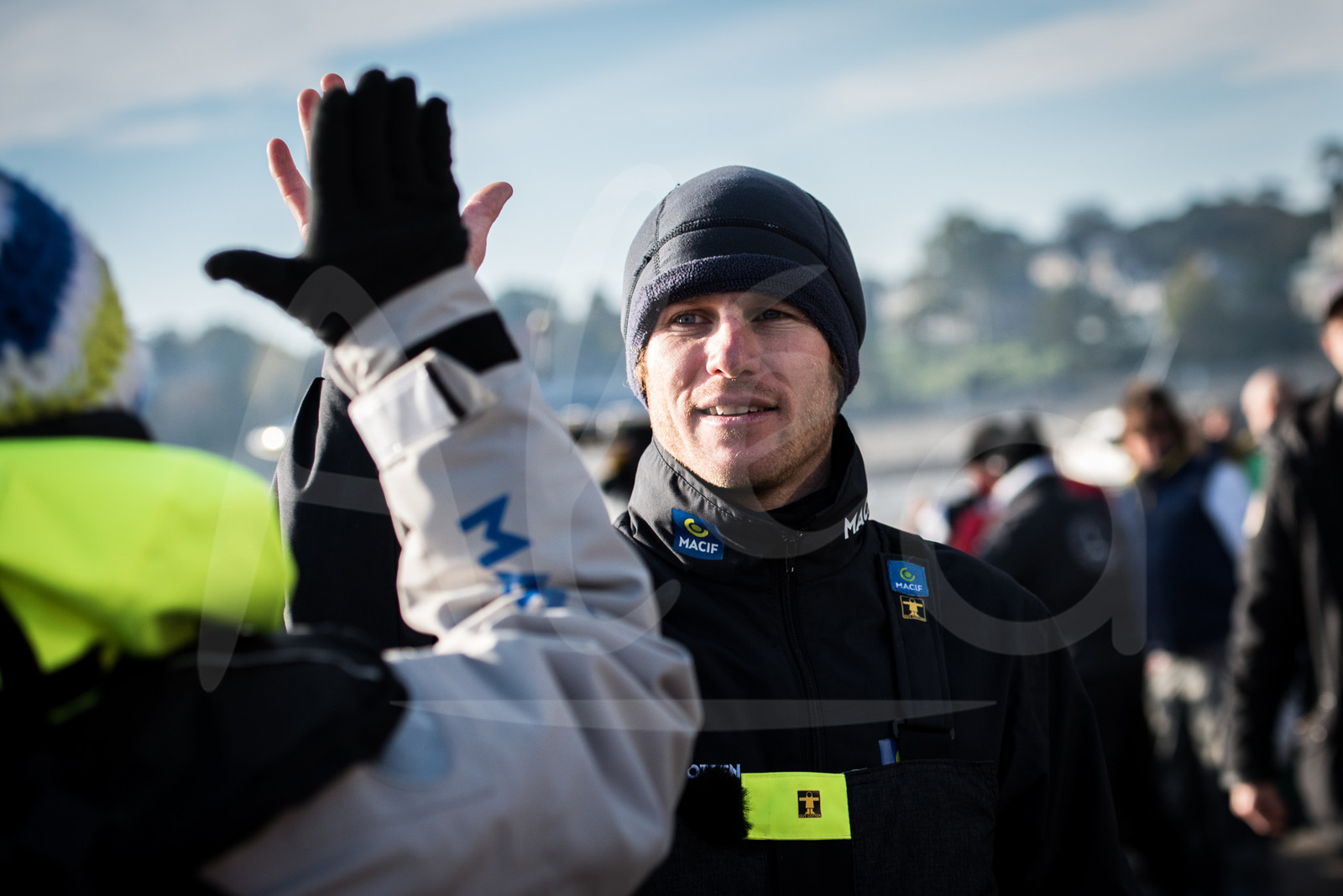 Description | Francois Gabart, skipper ultime MACIF, on his way to his boat offshore before start of the Route du Rhum 2018, on November 4th, 2018 in St-Malo, north Brittany, France - Photo Stephanie Billarant / Alea |