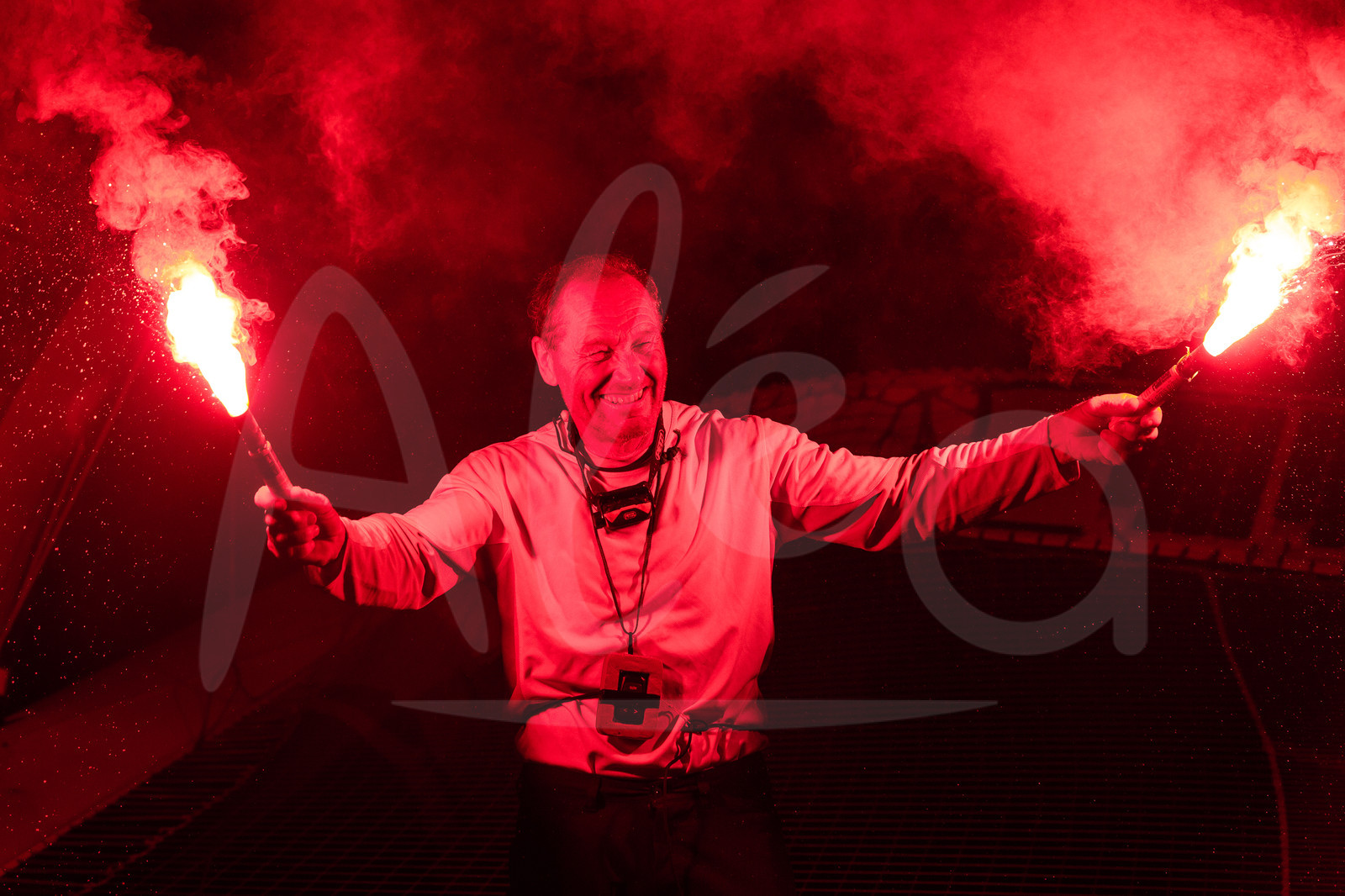| Description | Celebration with flares for the winner maxi trimaran IDEC Sport, skipper Francis Joyon, and new record in 7d 14h 21mn 47sec during arrival of the Route du Rhum 2018, on November 11th, 2018 in Pointe-a-Pitre, Guadeloupe, France - Photo Jean-Marie Liot / Alea |