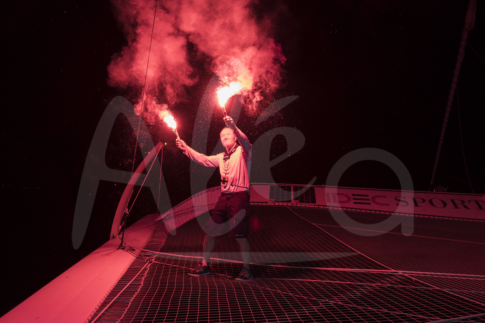 | Description | Celebration with flares for the winner maxi trimaran IDEC Sport, skipper Francis Joyon, and new record in 7d 14h 21mn 47sec during arrival of the Route du Rhum 2018, on November 11th, 2018 in Pointe-a-Pitre, Guadeloupe, France - Photo Jean-Marie Liot / Alea |