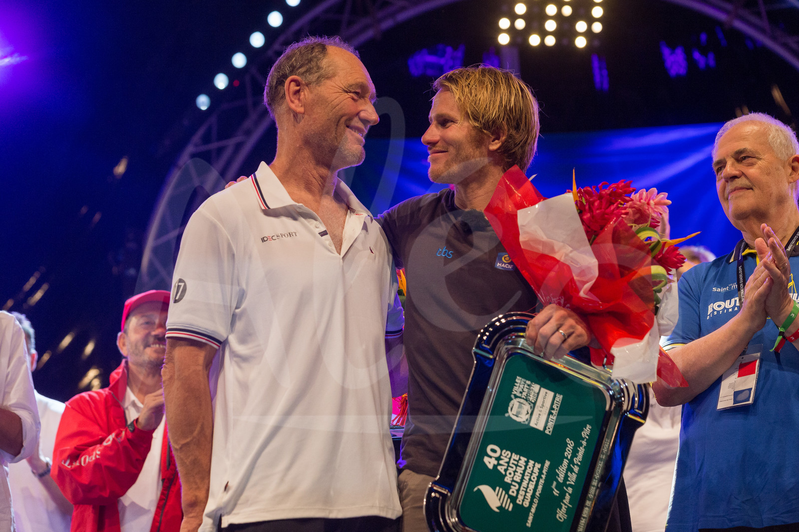 | Description | Celebration on podium for winner maxi trimaran IDEC Sport, skipper Francis Joyon with Patrice Lafargue (Groupe IDEC Pdt) - new record in 7d 14h 21mn 47sec, with 2nd place, Francois Gabart, skipper MACIF, during arrival of the Route du Rhum 2018, on November 11th, 2018 in Pointe-a-Pitre, Guadeloupe, France - Photo Jean-Marie Liot / Alea |