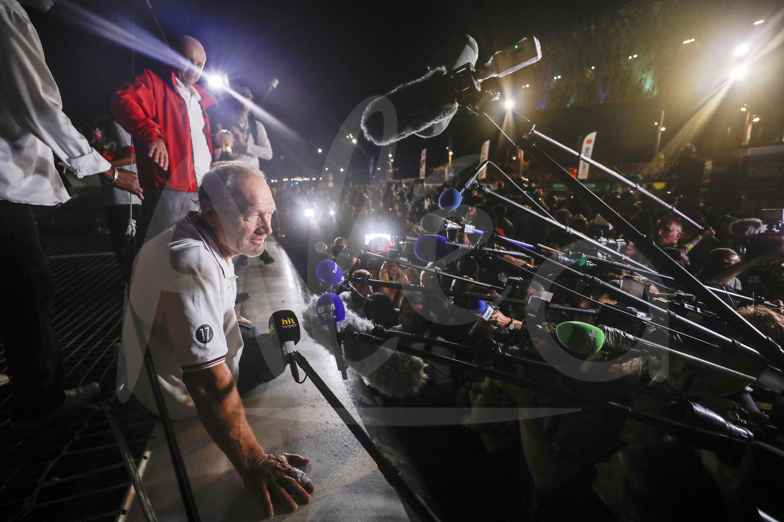 | Description | Media interview for winner maxi trimaran IDEC Sport, skipper Francis Joyon, and new record in 7d 14h 21mn 47sec during arrival of the Route du Rhum 2018, on November 11th, 2018 in Pointe-a-Pitre, Guadeloupe, France - Photo Jean-Marie Liot / Alea |