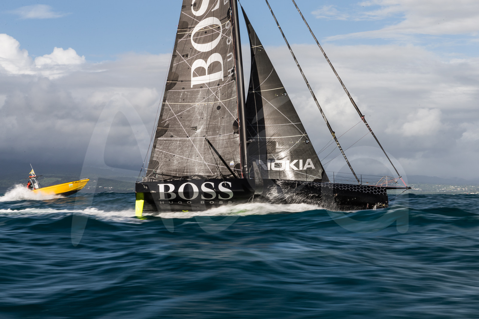 Description | Hugo Boss, skipper Alex Thomson, 1st arrived but had a 24 hours penalty for having used his engine after he grounded on rocks in North Guadeloupe, took 3rd place after penalty, during arrival of the Route du Rhum 2018, on November 16th, 2018 in Pointe-a-Pitre, Guadeloupe, France - Photo Jean-Marie Liot / Alea |