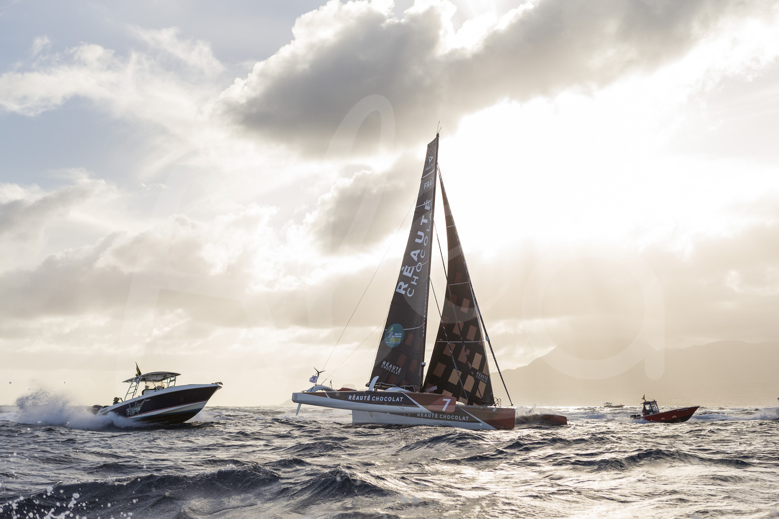 Description | Category multi 50, finish line for winner Reaute Chocolat, skipper Armel Tripon, third overall, during arrival of the Route du Rhum 2018, on November 15th, 2018 in Pointe-a-Pitre, Guadeloupe, France - Photo Jean-Marie Liot / Alea. |