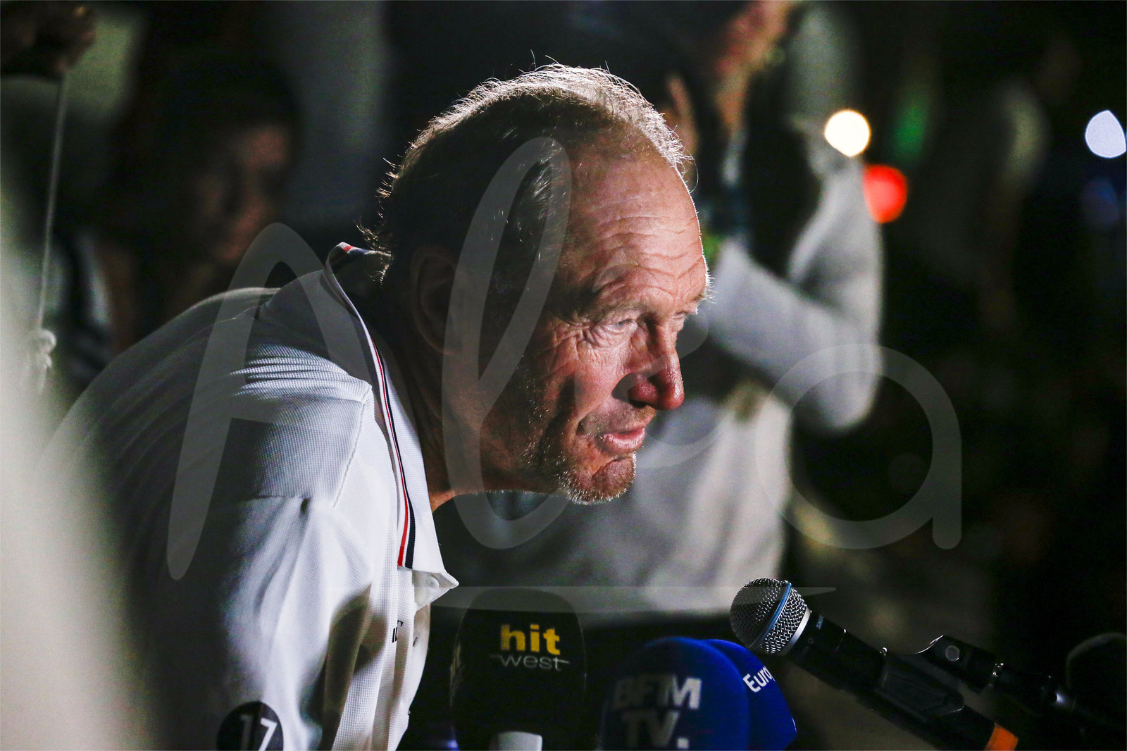 | Description | Media interview for winner maxi trimaran IDEC Sport, skipper Francis Joyon, and new record in 7d 14h 21mn 47sec during arrival of the Route du Rhum 2018, on November 11th, 2018 in Pointe-a-Pitre, Guadeloupe, France - Photo Jean-Marie Liot / Alea |