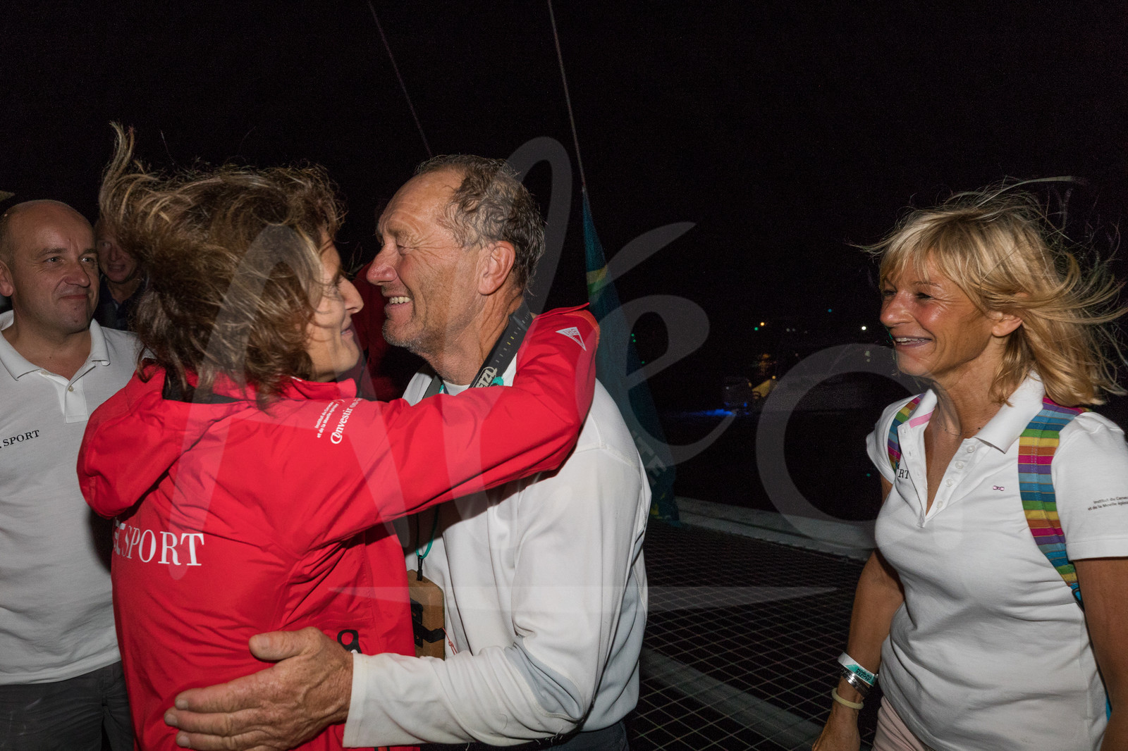 | Description | Celebration for the winner maxi trimaran IDEC Sport, skipper Francis Joyon, with his wife Virginie and Mrs Lafargue, and new record in 7d 14h 21mn 47sec during arrival of the Route du Rhum 2018, on November 11th, 2018 in Pointe-a-Pitre, Guadeloupe, France - Photo Jean-Marie Liot / Alea |