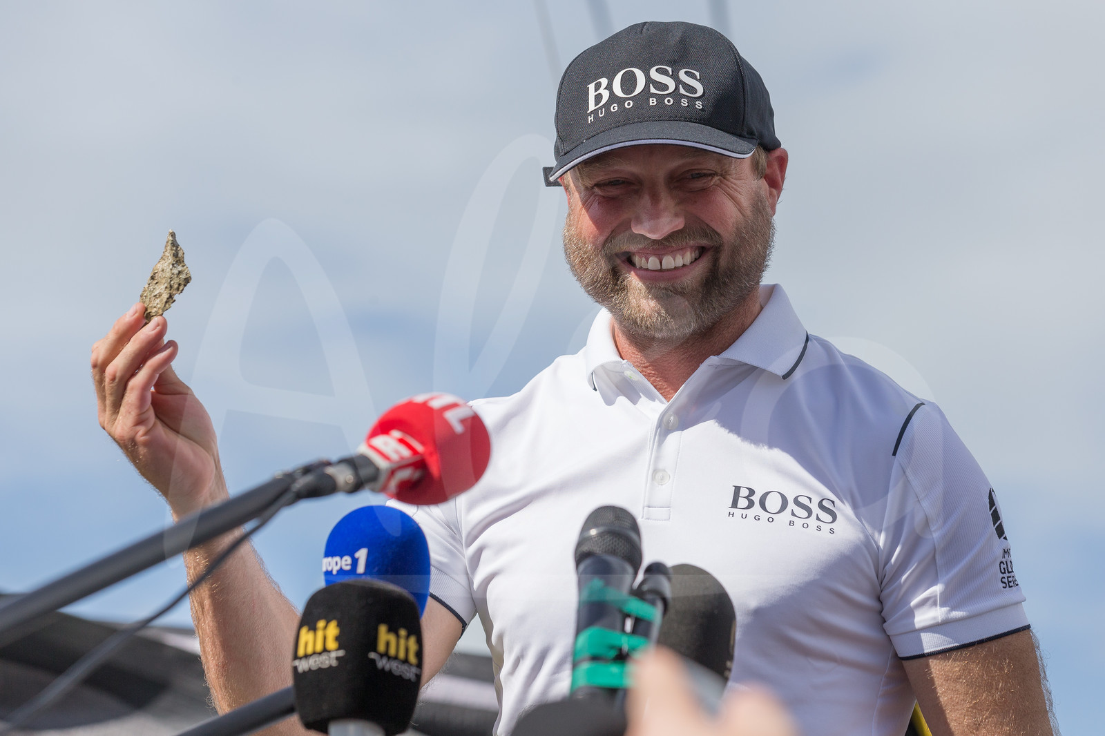 Description | Media with Hugo Boss, skipper Alex Thomson showing a little rock, 1st arrived but had a 24 hours penalty for having used his engine after he grounded on rocks in North Guadeloupe, took 3rd place after penalty, during arrival of the Route du Rhum 2018, on November 16th, 2018 in Pointe-a-Pitre, Guadeloupe, France - Photo Jean-Marie Liot / Alea |