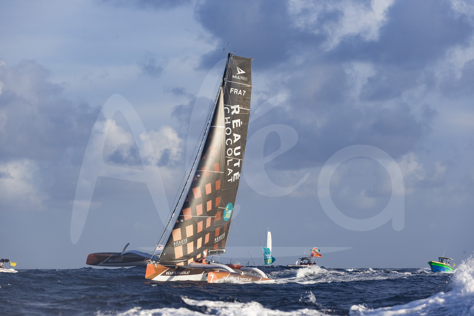 Description | Category multi 50, finish line for winner Reaute Chocolat, skipper Armel Tripon, third overall, during arrival of the Route du Rhum 2018, on November 15th, 2018 in Pointe-a-Pitre, Guadeloupe, France - Photo Jean-Marie Liot / Alea. |