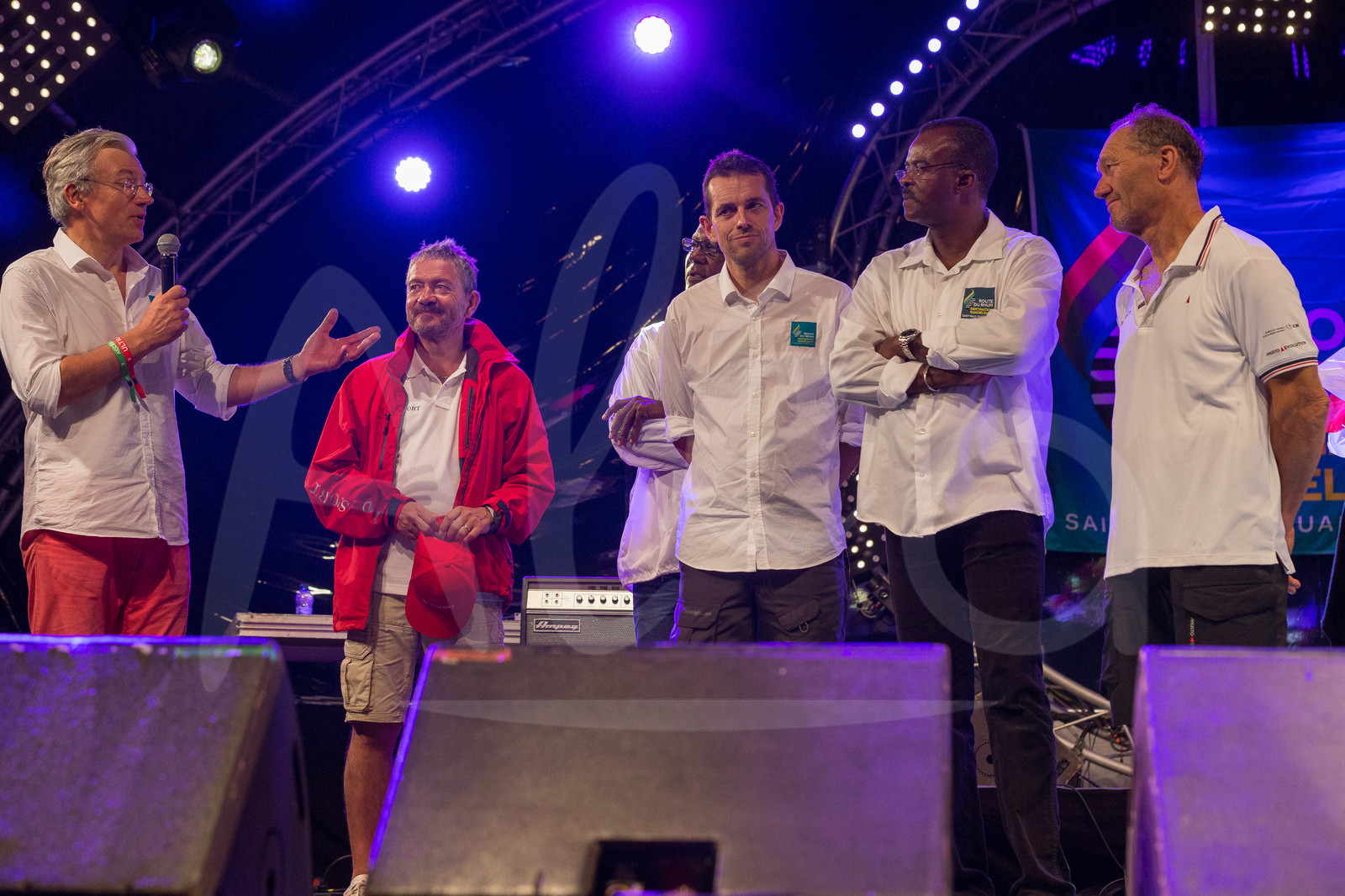 | Description | Celebration on podium for winner maxi trimaran IDEC Sport, skipper Francis Joyon with Patrice Lafargue (Groupe IDEC Pdt) in red jacket - new record in 7d 14h 21mn 47sec, during arrival of the Route du Rhum 2018, on November 11th, 2018 in Pointe-a-Pitre, Guadeloupe, France - Photo Jean-Marie Liot / Alea |