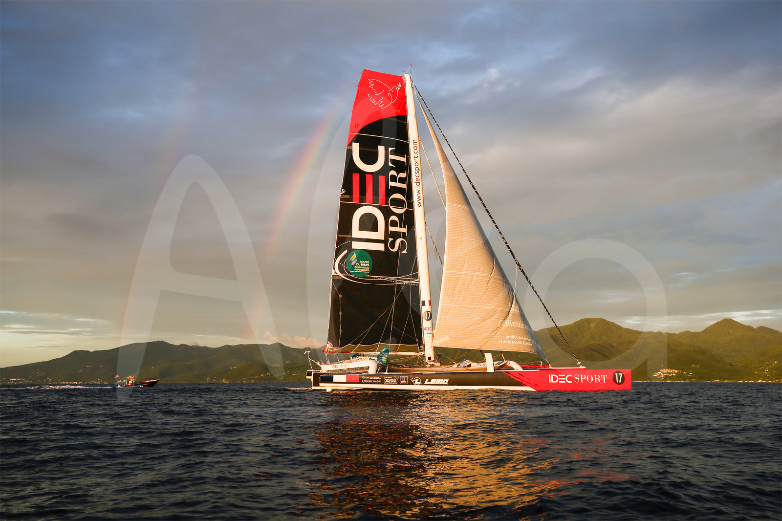 | Description | First images before finish for maxi trimaran IDEC Sport, skipper Francis Joyon, under a rainbow during arrival of the Route du Rhum 2018, on November 11th, 2018 in Pointe-a-Pitre, Guadeloupe, France - Photo Jean-Marie Liot / Alea |