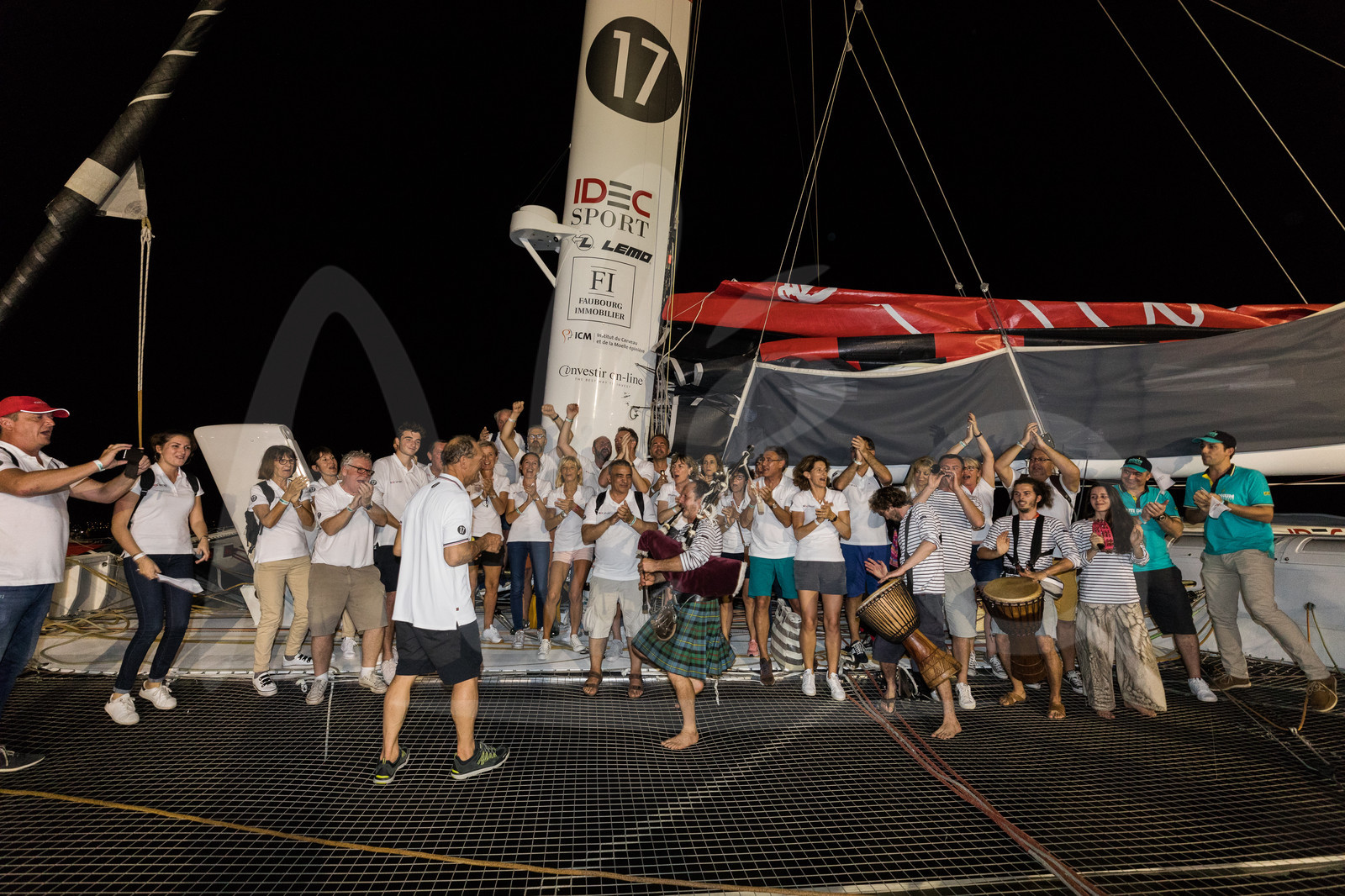 | Description | Celebration for winner maxi trimaran IDEC Sport, skipper Francis Joyon, and new record in 7d 14h 21mn 47sec during arrival of the Route du Rhum 2018, on November 11th, 2018 in Pointe-a-Pitre, Guadeloupe, France - Photo Jean-Marie Liot / Alea |