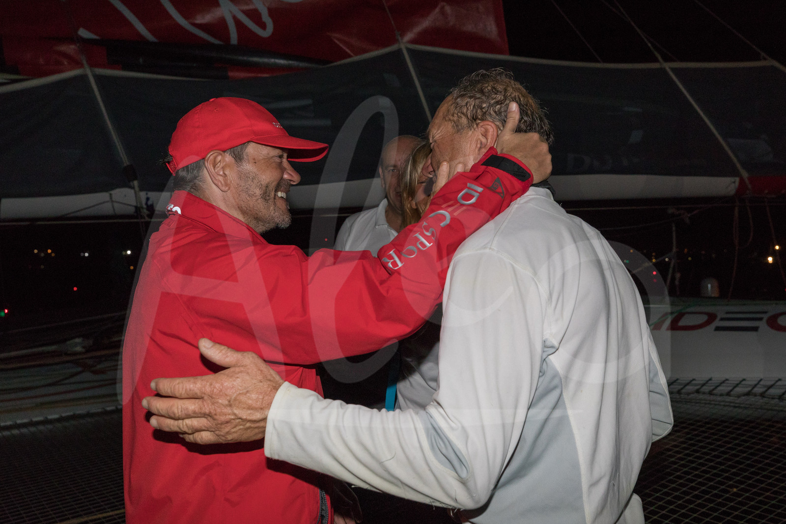 | Description | Celebration for the winner maxi trimaran IDEC Sport, skipper Francis Joyon, with Patrice Lafargue (Groupe IDEC Pdt), and new record in 7d 14h 21mn 47sec during arrival of the Route du Rhum 2018, on November 11th, 2018 in Pointe-a-Pitre, Guadeloupe, France - Photo Jean-Marie Liot / Alea |