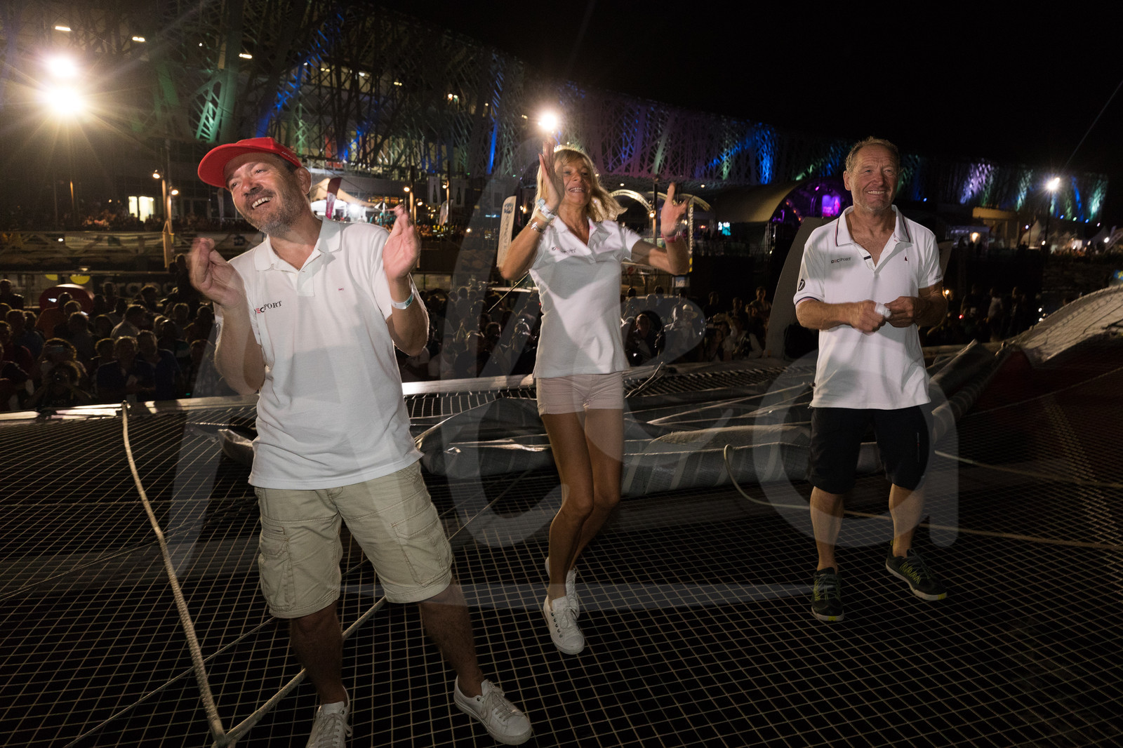 | Description | Celebration for winner maxi trimaran IDEC Sport, skipper Francis Joyon, his wife Virginie and Patrice Lafargue (Groupe IDEC Pdt) and new record in 7d 14h 21mn 47sec during arrival of the Route du Rhum 2018, on November 11th, 2018 in Pointe-a-Pitre, Guadeloupe, France - Photo Jean-Marie Liot / Alea |