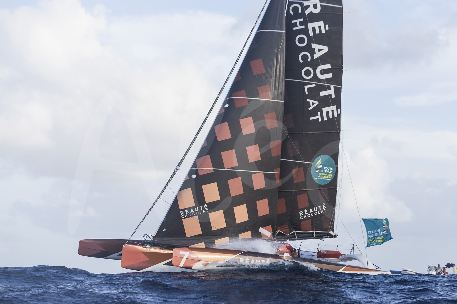 Description | Category multi 50, finish line for winner Reaute Chocolat, skipper Armel Tripon, third overall, during arrival of the Route du Rhum 2018, on November 15th, 2018 in Pointe-a-Pitre, Guadeloupe, France - Photo Jean-Marie Liot / Alea. |