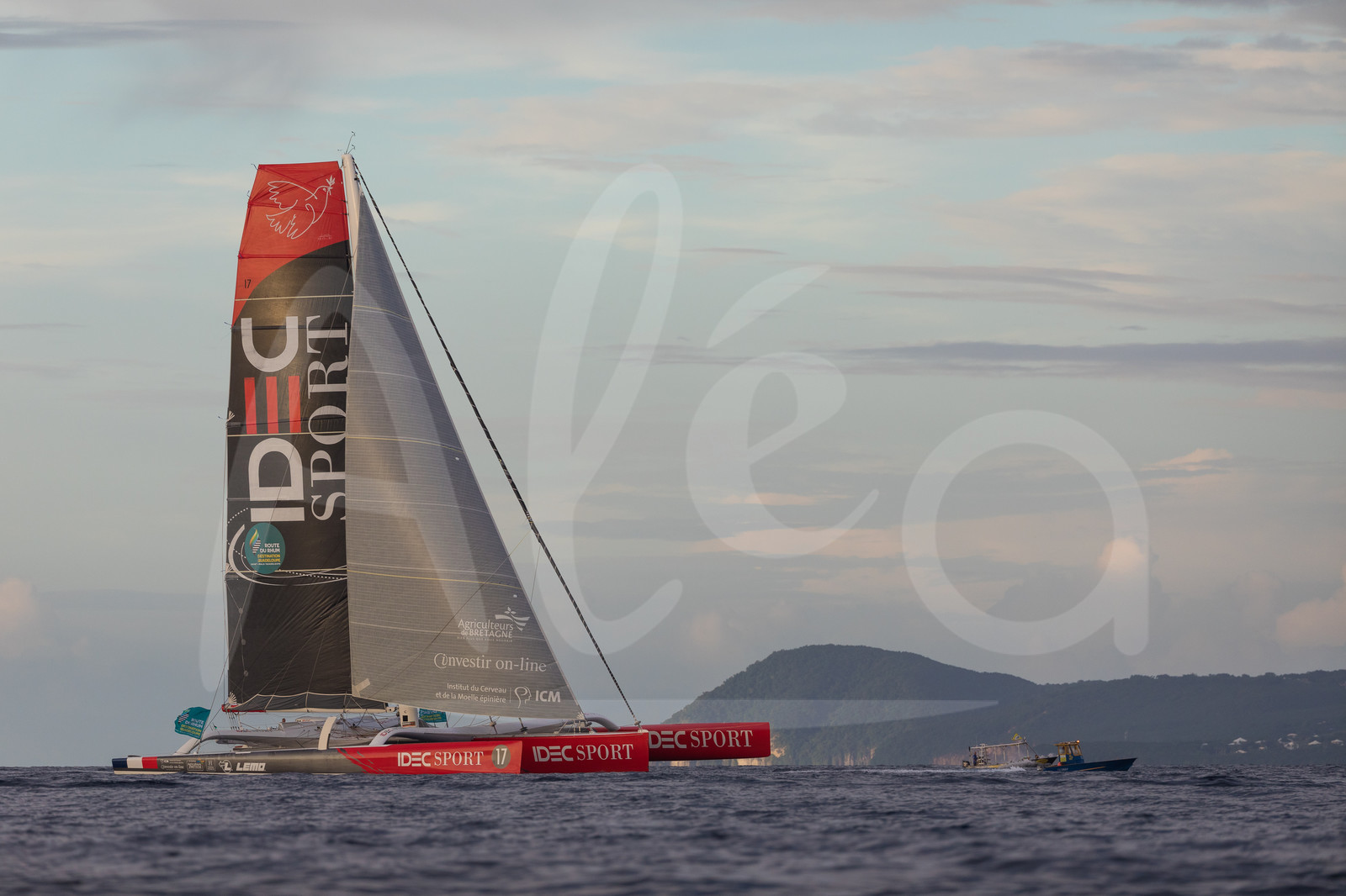 | Description | Last images before finish for maxi trimaran IDEC Sport, skipper Francis Joyon, during arrival of the Route du Rhum 2018, on November 11th, 2018 in Pointe-a-Pitre, Guadeloupe, France - Photo Jean-Marie Liot / Alea |
