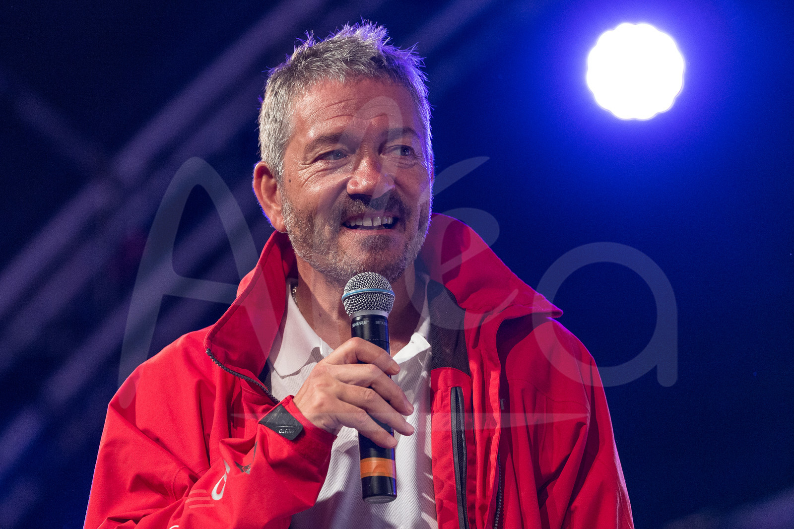 | Description | Celebration on podium for winner maxi trimaran IDEC Sport, skipper Francis Joyon - new record in 7d 14h 21mn 47sec, here Patrice Lafargue (Groupe IDEC Pdt) during arrival of the Route du Rhum 2018, on November 11th, 2018 in Pointe-a-Pitre, Guadeloupe, France - Photo Jean-Marie Liot / Alea |
