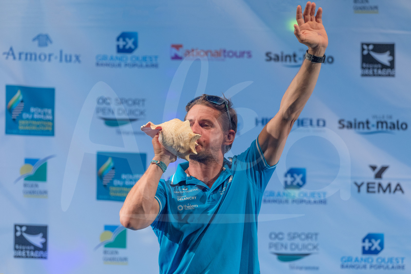 Description | Prize ceremony for Multi50, 3rd place Thibaut Vauchel-Camus, skipper ARSEP, playing music with a sea shell, after arrival of the Route du Rhum 2018, on November 17th, 2018 in Pointe-a-Pitre, Guadeloupe, France - Photo Jean-Marie Liot / Alea |