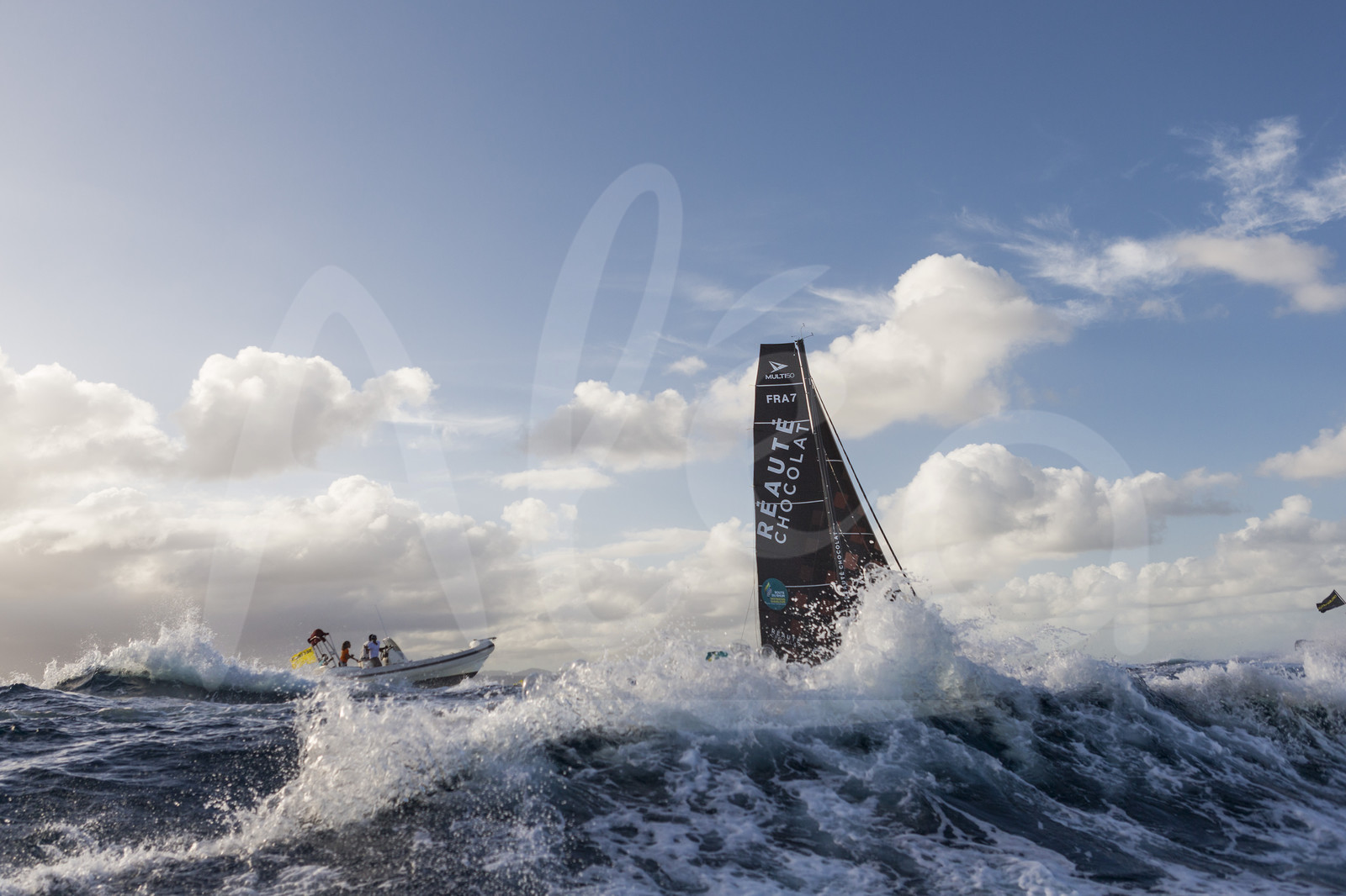 | Description | Category multi 50, finish line for winner Reaute Chocolat, skipper Armel Tripon, third overall, during arrival of the Route du Rhum 2018, on November 15th, 2018 in Pointe-a-Pitre, Guadeloupe, France - Photo Jean-Marie Liot / Alea. |