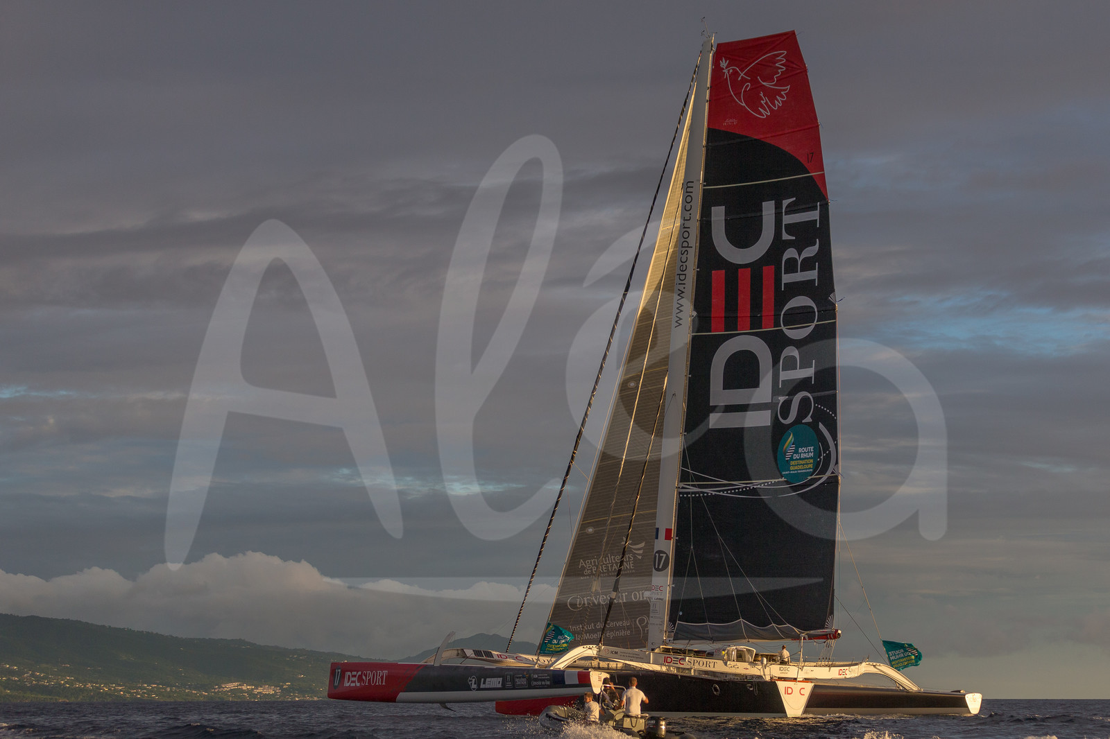 | Description | Last images before finish for maxi trimaran IDEC Sport, skipper Francis Joyon, during arrival of the Route du Rhum 2018, on November 11th, 2018 in Pointe-a-Pitre, Guadeloupe, France - Photo Jean-Marie Liot / Alea |