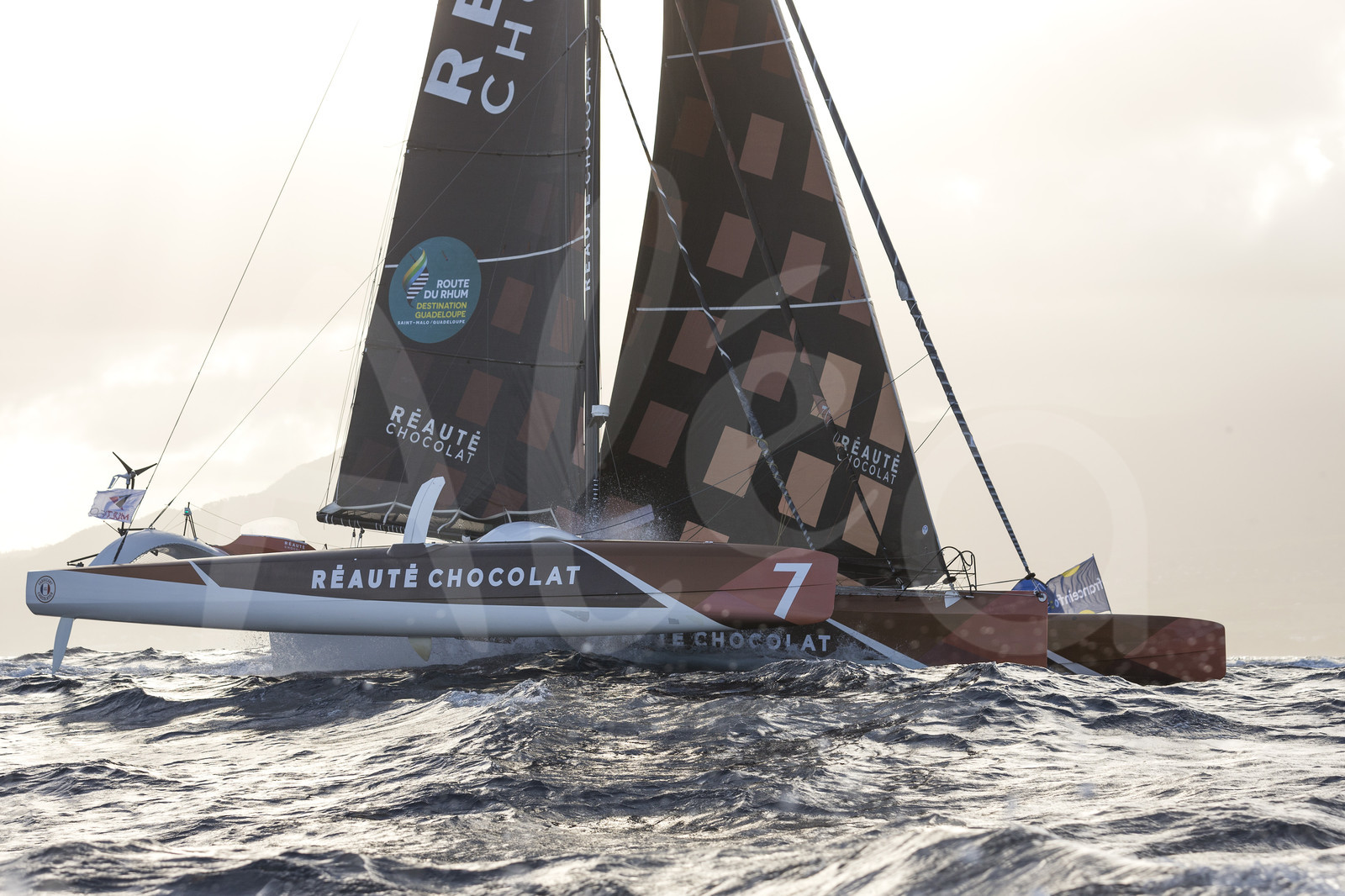 Description | Category multi 50, finish line for winner Reaute Chocolat, skipper Armel Tripon, third overall, during arrival of the Route du Rhum 2018, on November 15th, 2018 in Pointe-a-Pitre, Guadeloupe, France - Photo Jean-Marie Liot / Alea. |