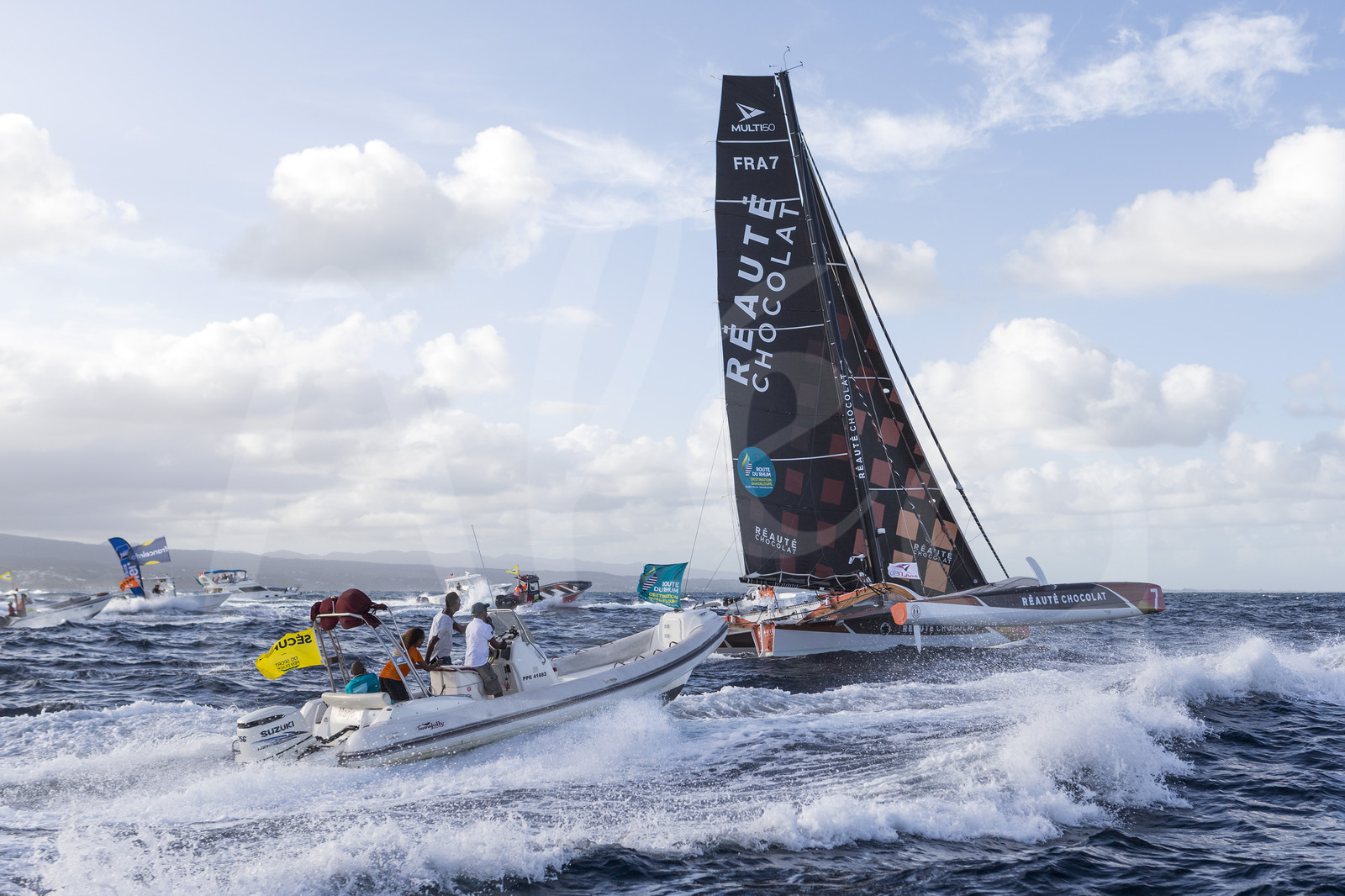 | Description | Category multi 50, finish line for winner Reaute Chocolat, skipper Armel Tripon, third overall, during arrival of the Route du Rhum 2018, on November 15th, 2018 in Pointe-a-Pitre, Guadeloupe, France - Photo Jean-Marie Liot / Alea. |