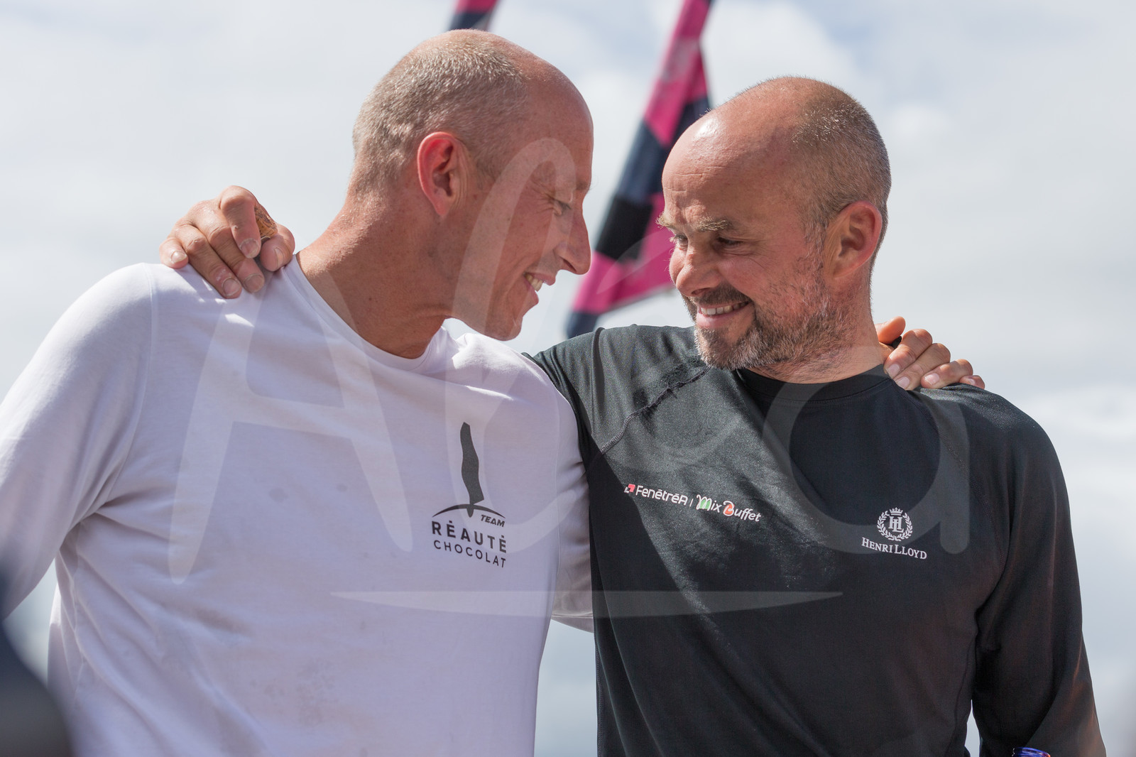 Description | 2nd place in category Multi50 for Erwan Leroux, skipper Fenetrea - Mix Buffet, congratulated by winner Armel Tripon, skipper Reaute Chocolat during arrival of the Route du Rhum 2018, on November 16th, 2018 in Pointe-a-Pitre, Guadeloupe, France - Photo Jean-Marie Liot / Alea |