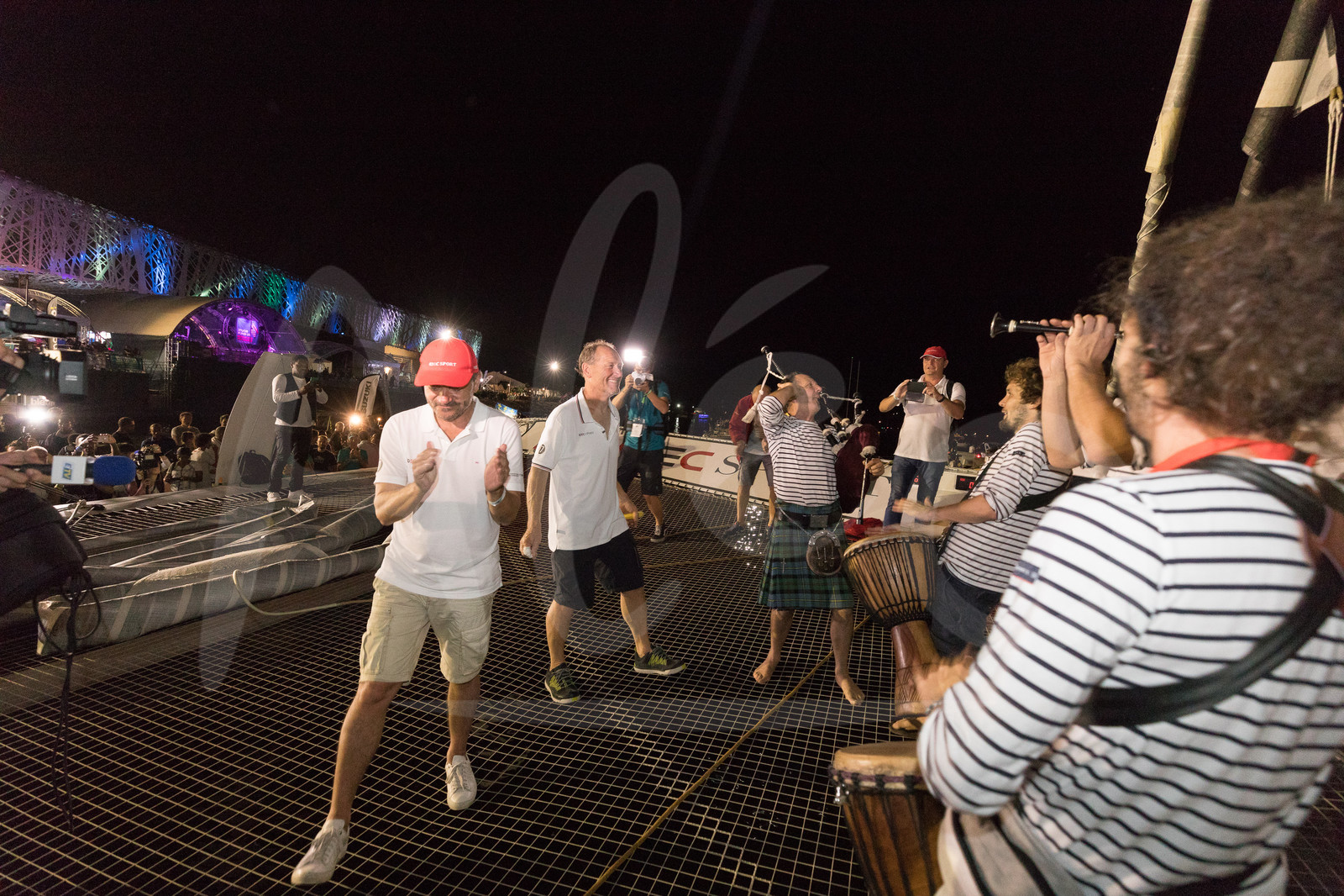 | Description | Celebration for the winner maxi trimaran IDEC Sport, skipper Francis Joyon, with Patrice Lafargue (Groupe IDEC Pdt) and new record in 7d 14h 21mn 47sec during arrival of the Route du Rhum 2018, on November 11th, 2018 in Pointe-a-Pitre, Guadeloupe, France - Photo Jean-Marie Liot / Alea |
