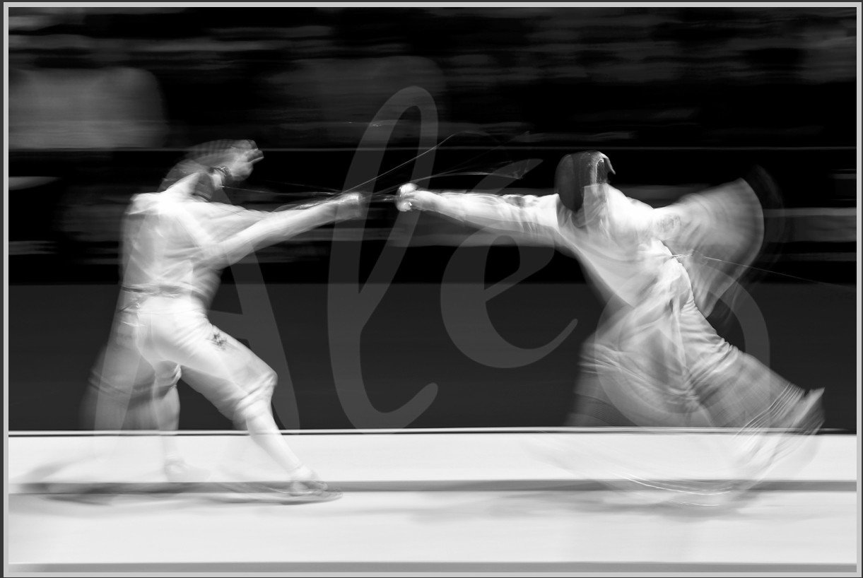 Description | Illustration noir et blanc et vitesse lente, action d'attaque et touche française contre USA, Mondiaux d’Escrime au Grand Palais - Photo Stéphane Allaman / Alea |