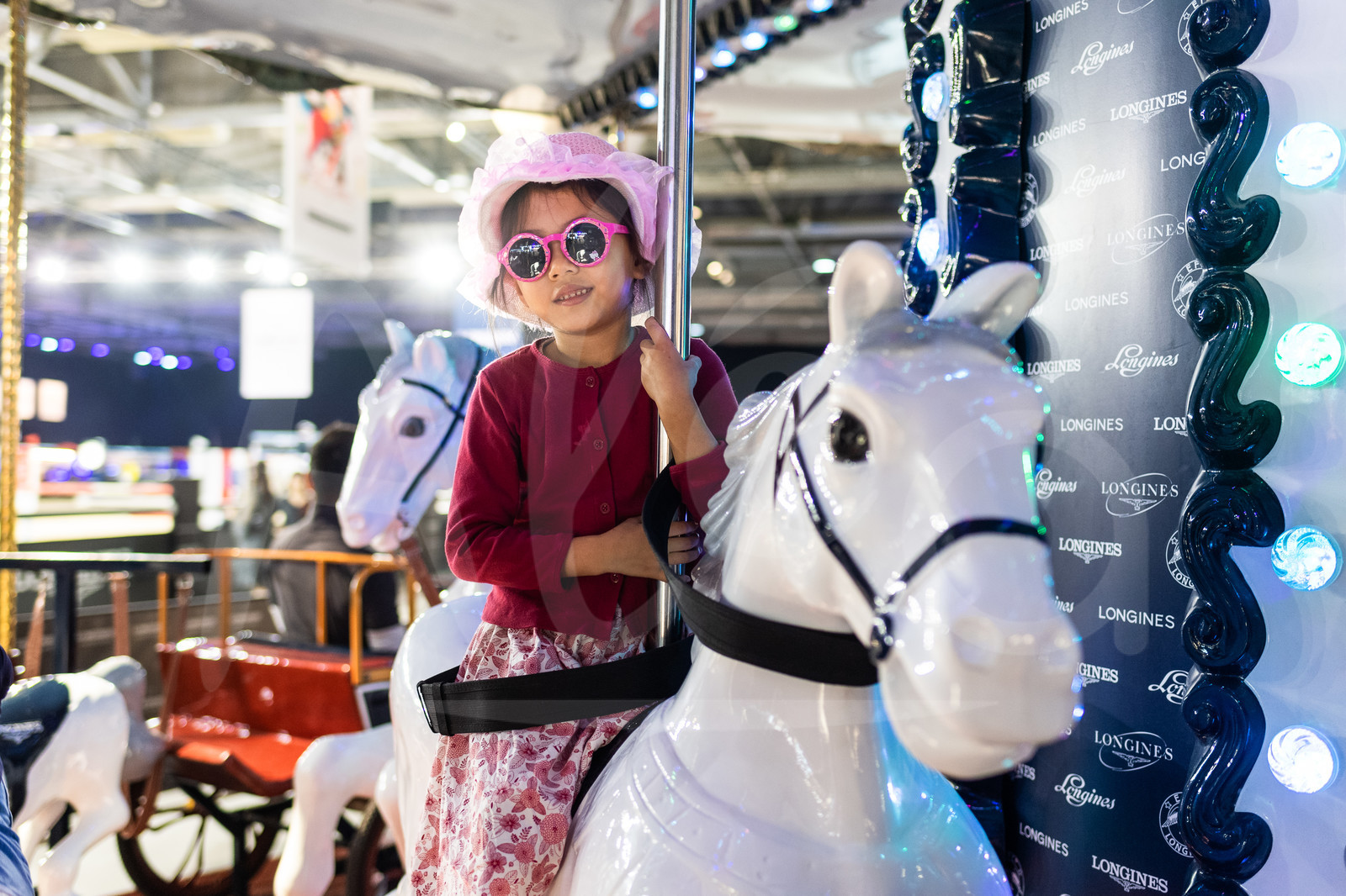 Description | Young star with sunglasses on the Longines carrousel in the Village Prestige at the Longines Masters Hong Kong 2019, Asia World Expo on February 17th, 2019 - Photo Jean-Louis Carli / Alea / EEM |