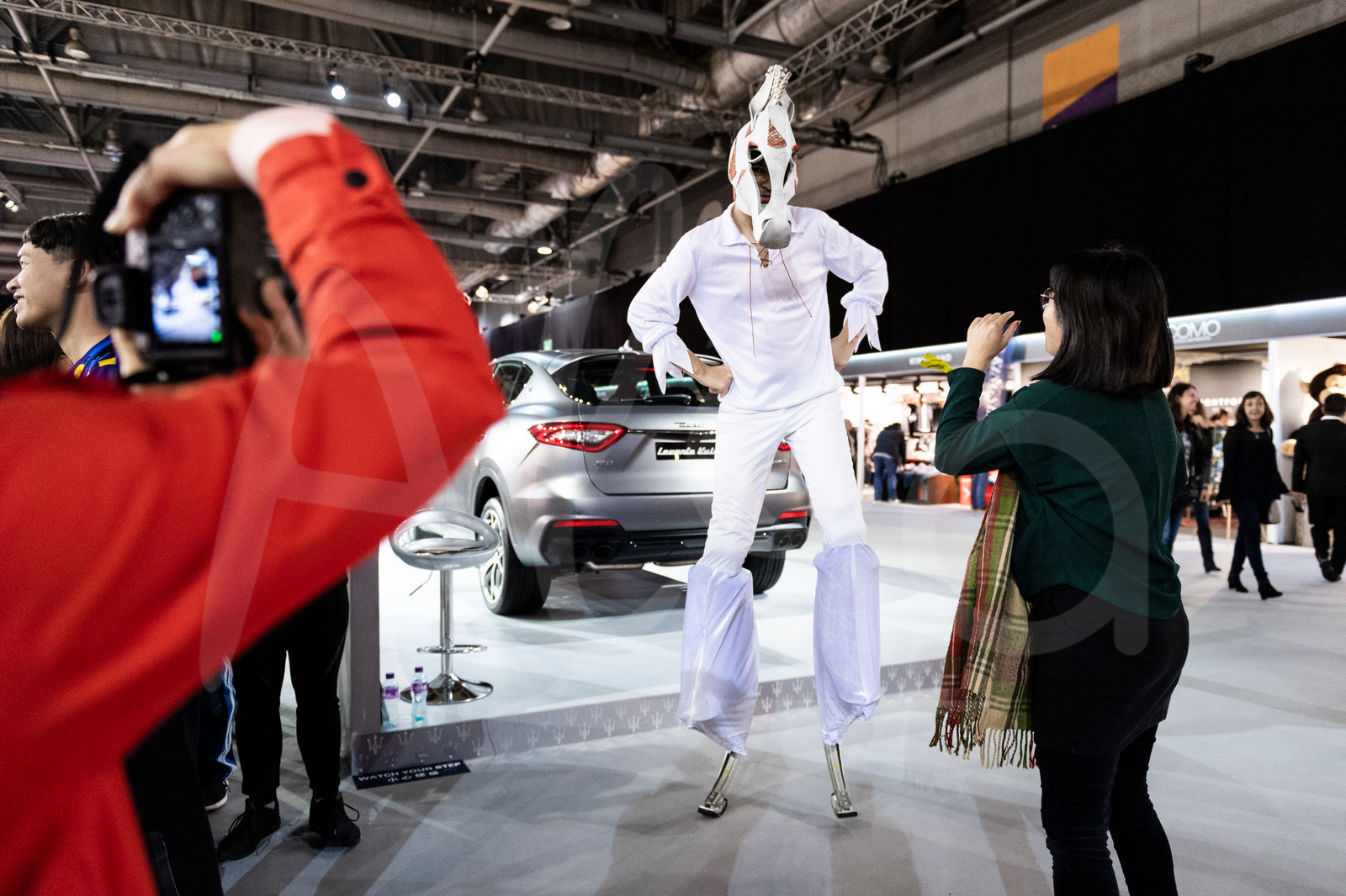 Description | Stilt walker pony mannequin in the Village Prestige of the Longines Masters Hong Kong 2019, at Asia World Expo on February 15th, 2019 - Photo Jean-Louis Carli / Alea / EEM |