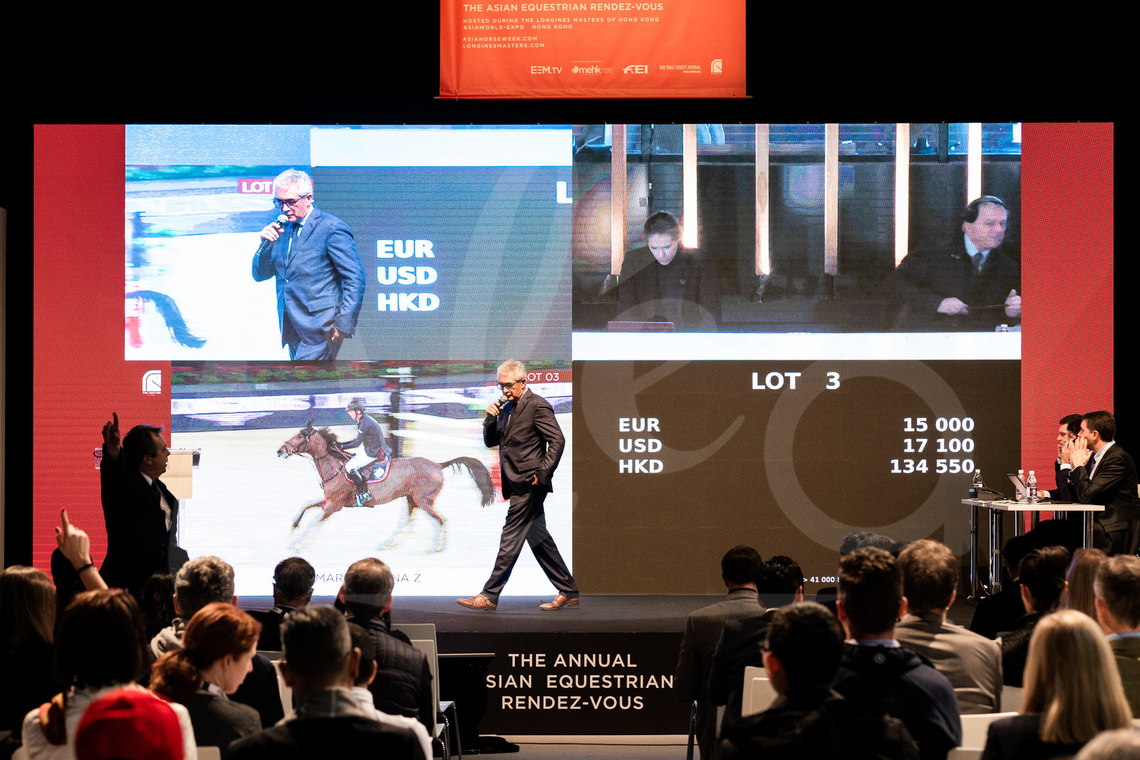Description | Speaker Eric HOYEAU, illustration at The Auction "The Embryo Collection" during the Longines Masters Hong Kong 2019, at Asia World Expo on February 15th, 2019 - Photo Jean-Louis Carli / Alea / EEM |