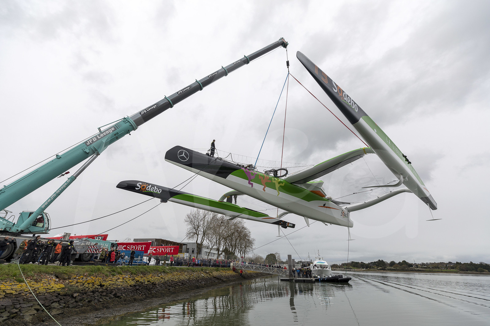 Description | Launching new Sodebo Ultim 3, skipper Thomas Coville, Multiplast shipyard in Vannes (France), on March 18th, 2019 - Photo Jean-Marie Liot / Alea |