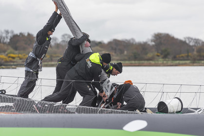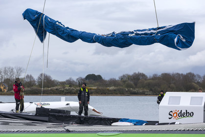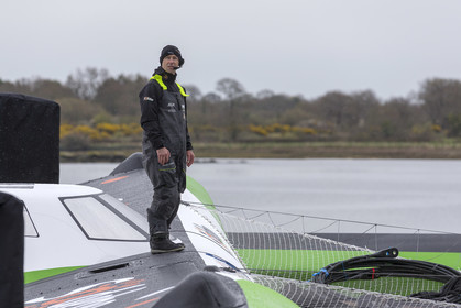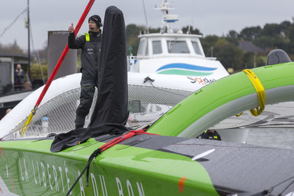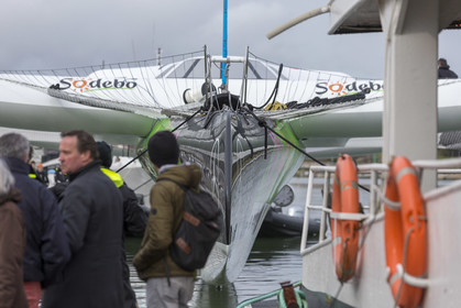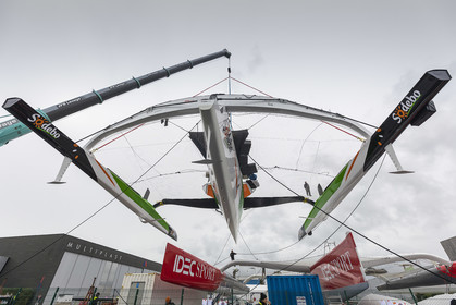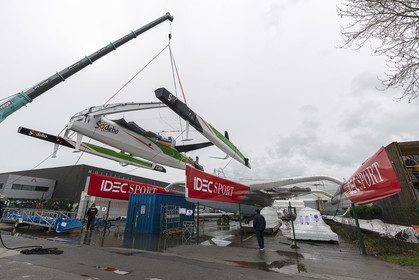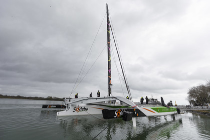 Sélection de photos de la mise à l'eau du nouvel Ultime Sodebo 3, maxi trimaran révolutionnaire avec le mat situé à l'arrière du carré, à Vannes. Il a été construit au chantier Multiplast de Vannes.