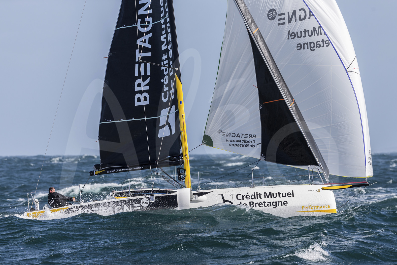 Description | Figaro 3 Bretagne CMB, skipper Espoir Tom Laperche with skipper Performance Loïs Berrehar, training off les Iles Glenan, on March 10th, 2019 - Photo Jean-Marie Liot / Alea. |