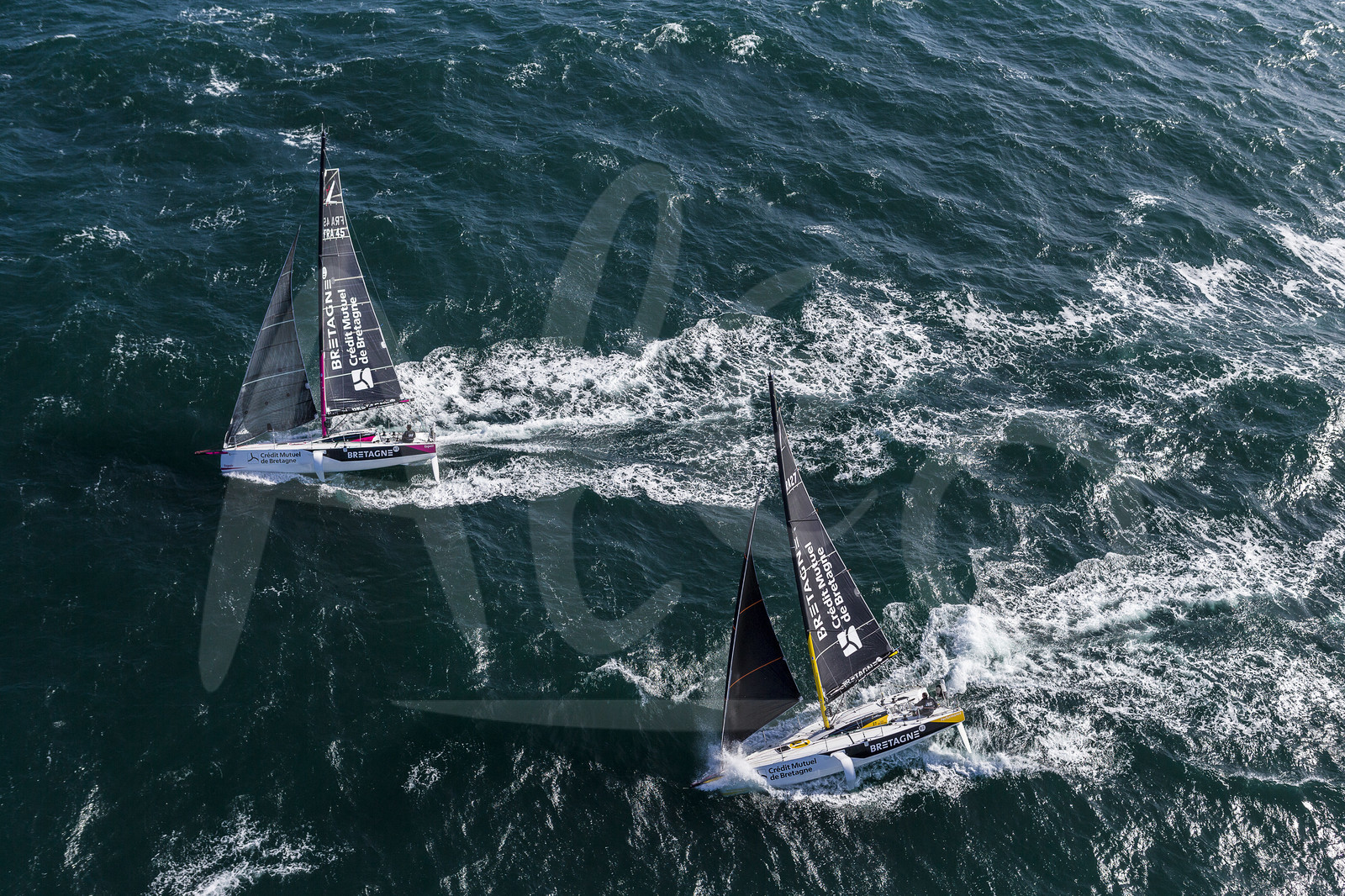 Description | Figaro 3 Bretagne CMB, skipper Espoir Tom Laperche with skipper Performance Loïs Berrehar, training off les Iles Glenan, on March 10th, 2019 - Photo Jean-Marie Liot / Alea. |