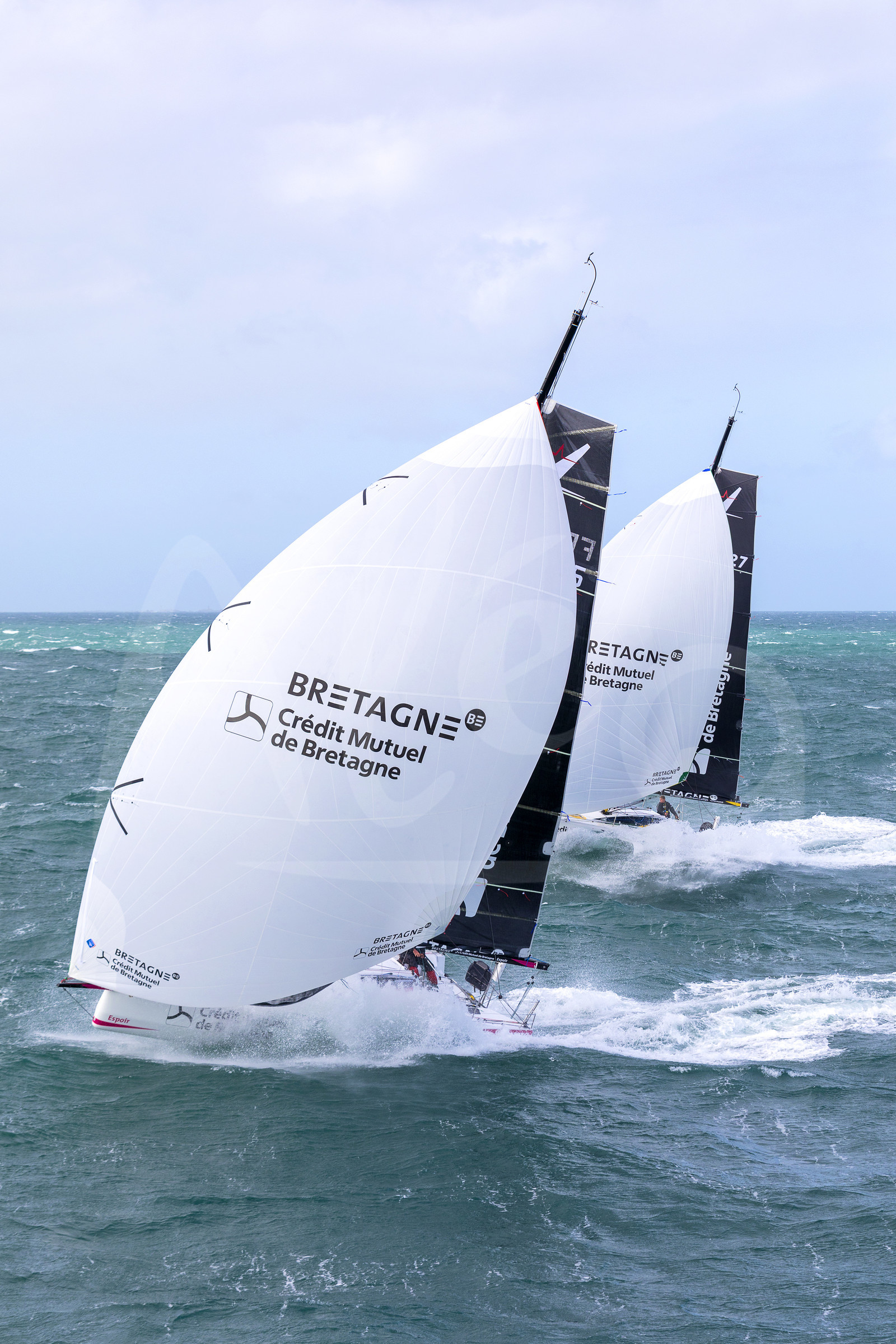Description | Figaro 3 Bretagne CMB, skipper Espoir Tom Laperche with skipper Performance Loïs Berrehar, training off les Iles Glenan, on March 10th, 2019 - Photo Jean-Marie Liot / Alea. |