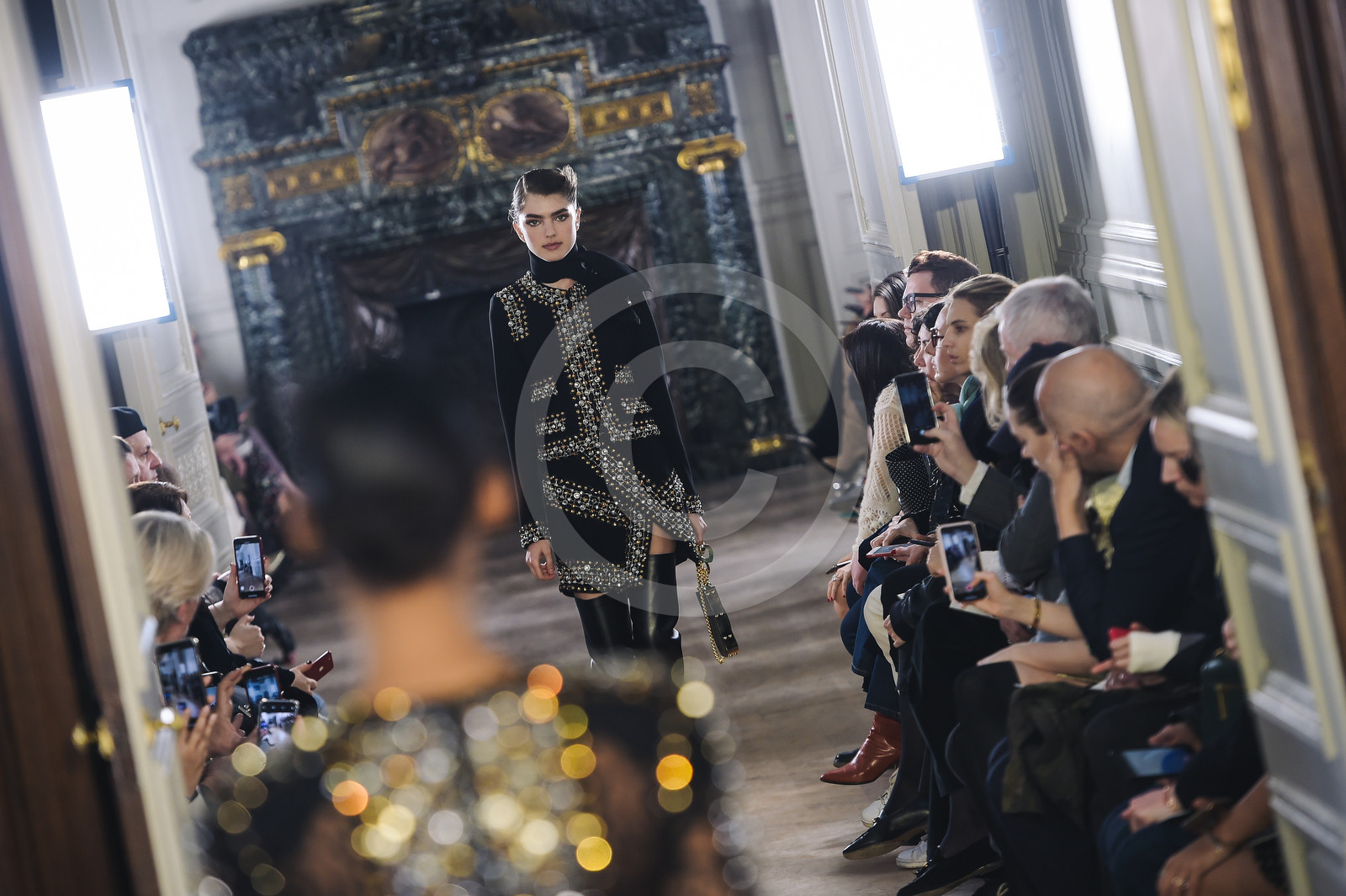Description | Models poses during the Elie Saab Fall-Winter 2019/2020 Ready-to-Wear collection fashion show in Paris, on March 2, 2019 - Photo Lucas BARIOULET |