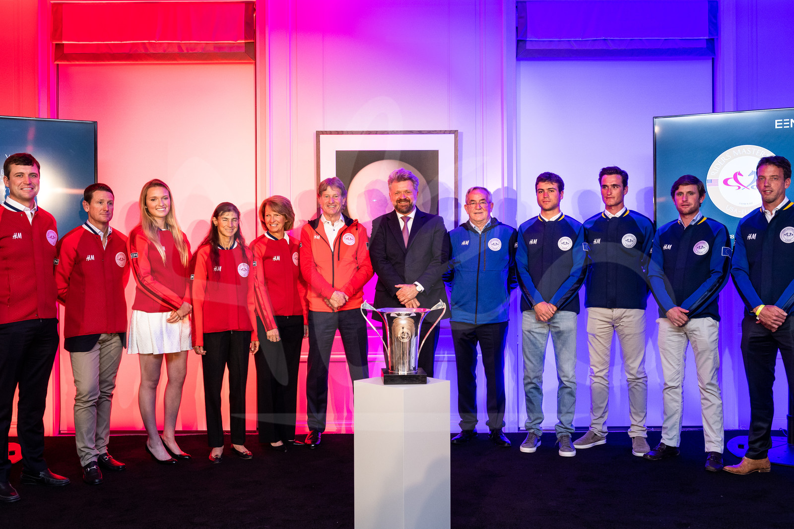 | Description | Presentation of the US and European teams for the Riders Masters Cup trophy, from left to right, Team US, RYAN Devin, WARD Mclain, KEENAN Lillie, CHAPOT Laura, MADDEN Beezie, Robert Ridland (coach), Christophe Ameeuw (PDG EEM), Team Europe, Philippe Guerdat, (coach), LEVY, Edward / FRA, PHILIPPAERTS, Olivier / BEL, DARRAGH Kenny, SMOLDERS Harry during the Longines Masters New York 2019, at Bloomberg Philanthrophies, on April 24th, 2019 - Photo Jean-Louis Carli / Alea / EEM |