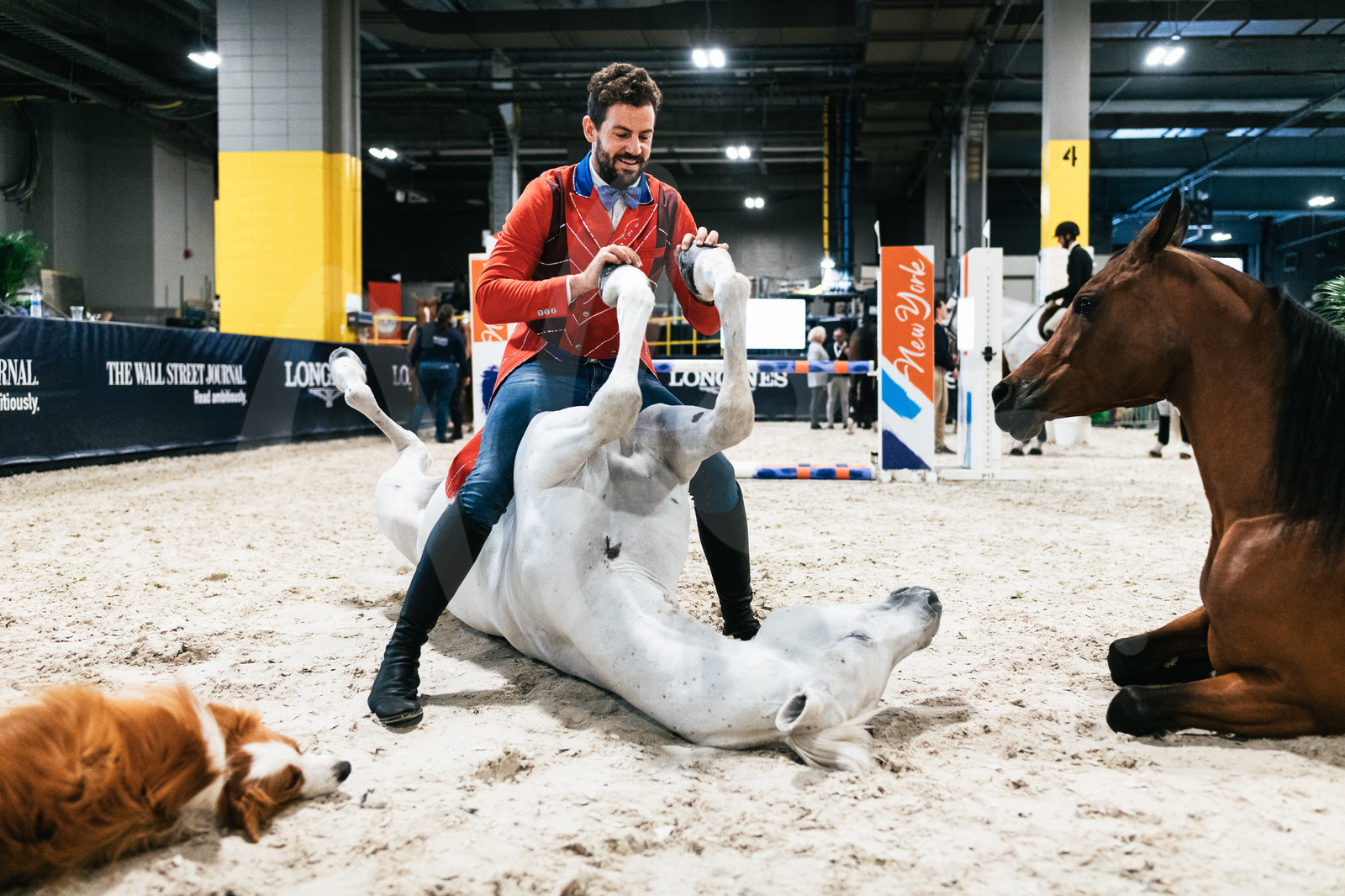 Description | Santi Serra training with horses and dogs at the Longines Masters New York 2019, at NYCB Live, home of the Nassau Veteran's Memorial Coliseum, on April 26th, 2019 - Photo Jean-Louis Carli / Alea / EEM |