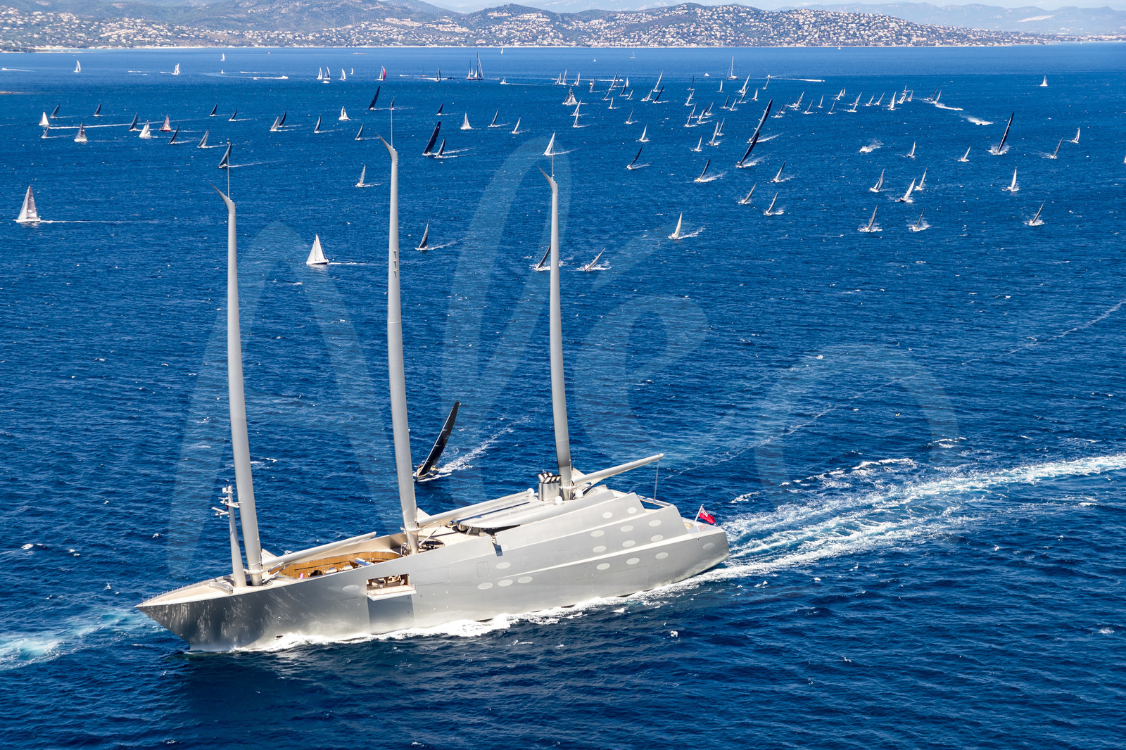 Description | SAINT-TROPEZ, FRANCE - JUNE 12, 2019 : One of the world's largest Sailing Yacht called "White Pearl" or "Sailing Yacht A" passes by the fleet of the offshore Rolex Giraglia sailing race, on June 12, 2019, off Saint-Tropez, France. (Photo by Studio Borlenghi/ALeA). |
