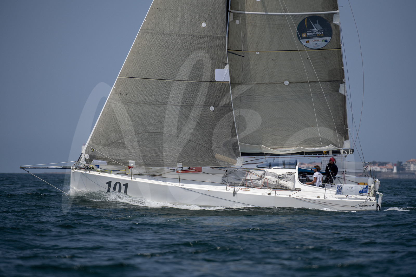 Description | LES SABLES D'OLONNE - JUNE 30, 2019 : French skippers Charles Louis Mourruau and Estelle Greck, on Colombre XL, takes the start of the Class 40 sailing race in duo, Les Sables - Horta - Les Sables on June 30, 2019, off Les Sables d'Olonne, France. (Photo by Olivier Blanchet/Alea) |