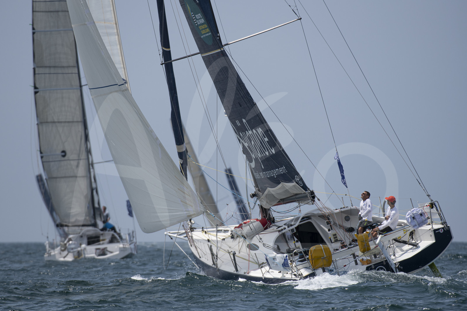 Description | LES SABLES D'OLONNE - JUNE 30, 2019 : French skippers Martin Louchart and Frederick Duchemin, on Des voiles et Martin, takes the start of the Class 40 sailing race in duo, Les Sables - Horta - Les Sables on June 30, 2019, off Les Sables d'Olonne, France. (Photo by Olivier Blanchet/Alea) |