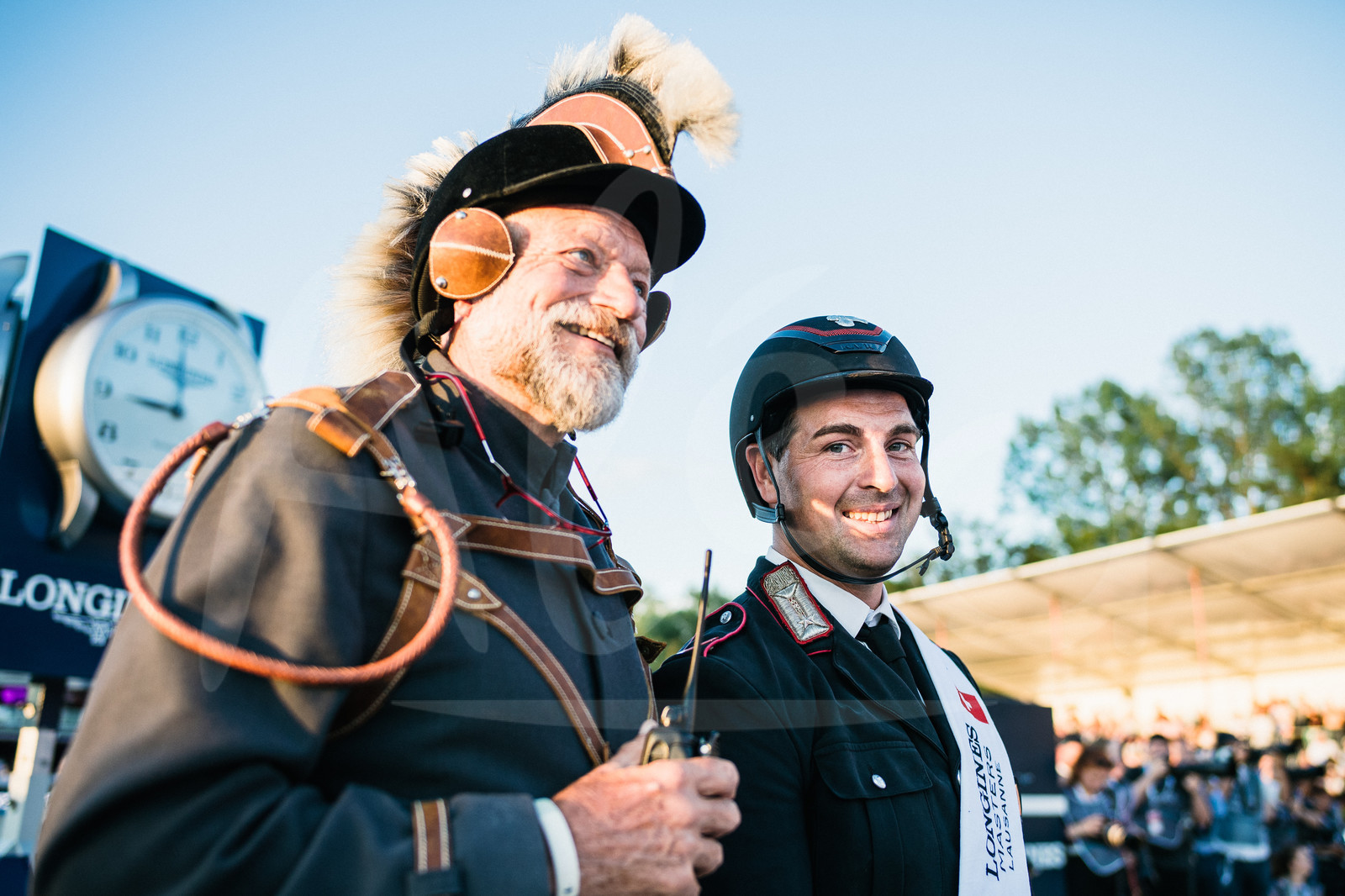 | Description | LAUSANNE, SWITZERLAND - JUNE 22, 2019 : Pedro Cebulka, ringmaster, leads Italian rider Emanuele Gaudiano, winner of the Longines Speed Challenge, to the podium during the Longines Masters Lausanne, on June 22, 2019 in Lausanne, Switzerland. (Photo by Jean-Louis Carli/ALeA/EEM) |